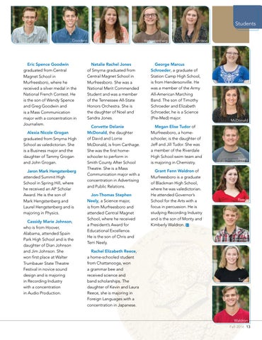 Eric Spence Goodwin graduated from Central Magnet School in Murfreesboro, where he received a silver medal in the National French Contest. He is the son of Wendy Spence and Greg Goodwin and is a Mass Communication major with a concentration in Journalism. Alexia Nicole Grogan graduated from Smyrna High School as valedictorian. She is a Business major and the daughter of Tammy Grogan and John Grogan. Jaron Mark Hengstenberg attended Summit High School in Spring Hill, where he received an AP Scholar Award. He is the son of Mark Hengstenberg and Laurel Hengstenberg and is majoring in Physics. Cassidy Marie Johnson, who is from Hoover, Alabama, attended Spain Park High School and is the daughter of Dian Johnson and Jim Johnson. She won first place at Walter Trumbauer State Theatre Festival in novice sound design and is majoring in Recording Industry with a concentration in Audio Production.