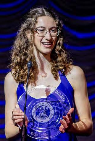 As part of creating a new tradition at MTSU, 2024–25 student leadership award recipients Victoria Grigsby, Ariel Nicastro, Zachary Thomas, and Connor Prim shared the spotlight with 12 other individuals and organizations honored with True Blue Honors Bolt awards at an April 2025 ceremony.