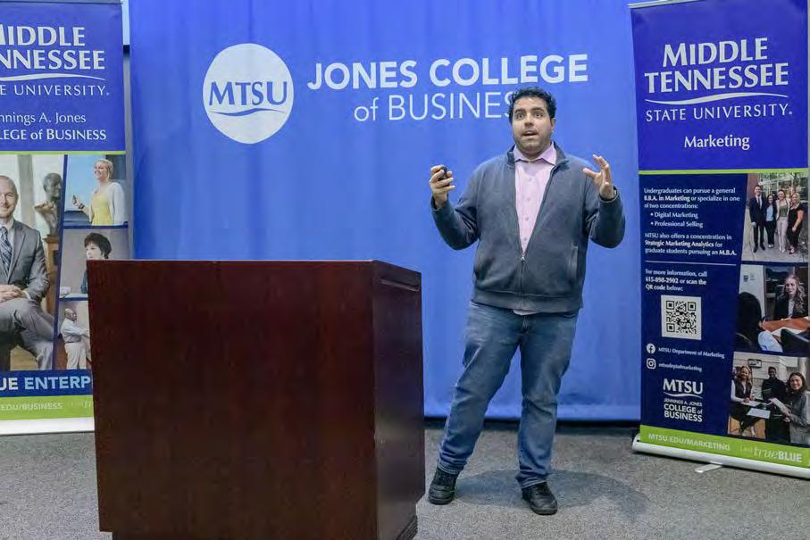 Students at MTSU’s Jones College of Business enjoyed a front-row seat to the future of artificial intelligence during a guest lecture by a product marketing manager for Google Gemini. Alessandro Cannas was invited to campus by MTSU’s Gaia Rancati, assistant professor of marketing and neuromarketing in the Jones A. College of Business and coordinator of the Neuromarketing and AI Lab. Rancati said she brought Cannas to campus to provide students with “a behind-the-scenes look at how Google is shaping the future of marketing and customer experience through AI innovation and product strategy.” Cannas’ presentation, held in the State Farm Room of the Business and Aerospace Building, highlighted Google’s Gemini platform and its transformative impact on marketing, education and innovation. Cannas shared his personal journey from Italy to Google, detailing his work on Gemini, Google’s multimodal AI model. Cannas noted the speed at which AI went from an experimental sector to an increasingly popular consumer product with products like ChatGPT and other new Large Language Models, or LLMs, that moved AI technology forward. “It was exciting to be in a moment where the entire industry was changing before our eyes,” he said.