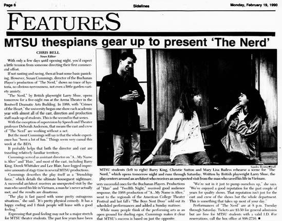 During her final semester, Cummings directed the Buchanan Players’ production of The Nerd in MTSU’s arena theater—a space that today bears the name of her mentor, Anderson. MTSU’s Sidelines published a review of the play in which news editor Chris Bell wrote, “Student director Susan Cummings has proven her ability here with her first solo e ort. Her clean staging lets the actors do their work, and that’s enough to make The Nerd worth seeing.”