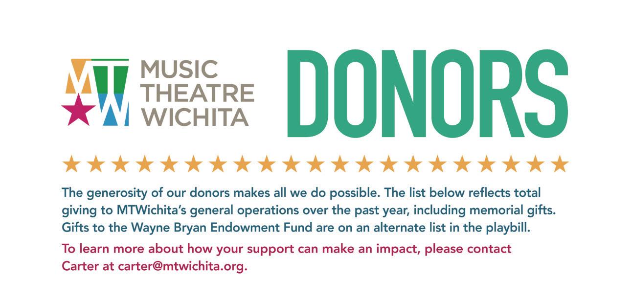 Matt Allen, Amanda Lea LaVergne, Soara-Joye Ross, and Stage Managers Jenny Lang and Erin Mittman appear with Music Theatre Wichita through the courtesy of Actors’ Equity Association, the union of professional stage actors and stage managers. Music Theatre Wichita operates under a U/RTA agreement with Actors’ Equity Association. Eric Sciotto appears through the courtesy of the Stage Directors and Choreographers Society. Robert Kovach appears through the courtesy of United Scenic Artists Local 829. Katherine Jackman Hanscom appears as a walk-on performer.