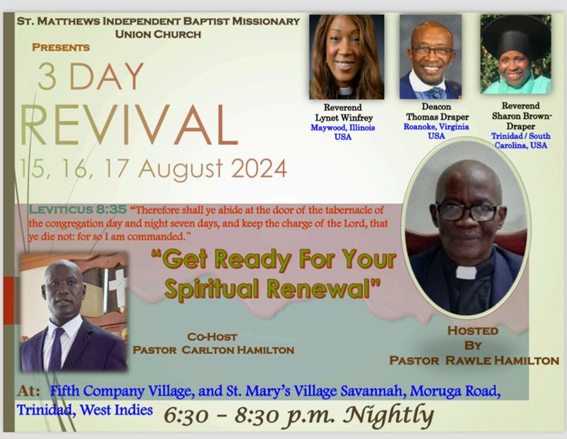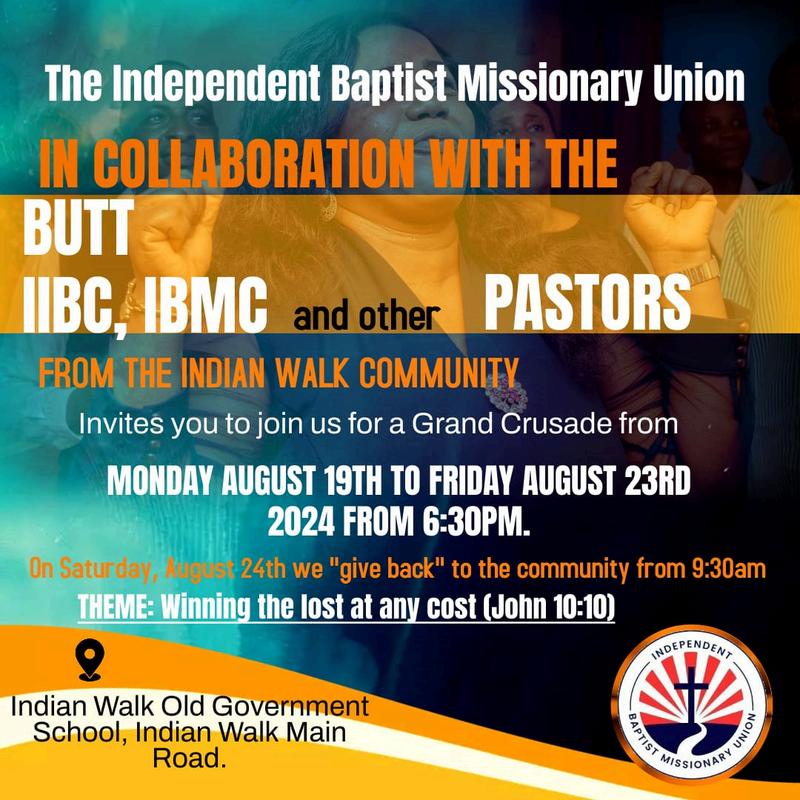 In preparation for the IBMU Upcoming crusade, the Union will be hosting a 3 day prayer and fast at St. Ann #1, St. Ann #2 and Bethany IBMU Church from Tuesday 13th to Thursday 15th August 2024, from 6:00am to 6:00pm, AT THE SAME TIME. Members are asked to attend the church that is closest to you, let us support as we continue to uplift this event in prayer