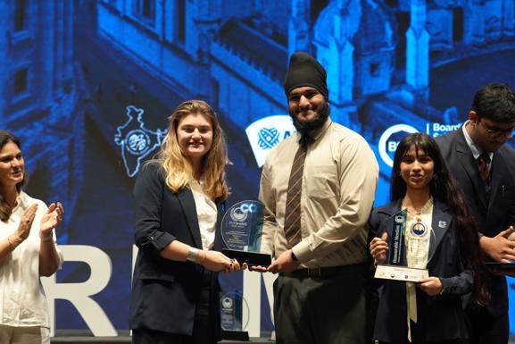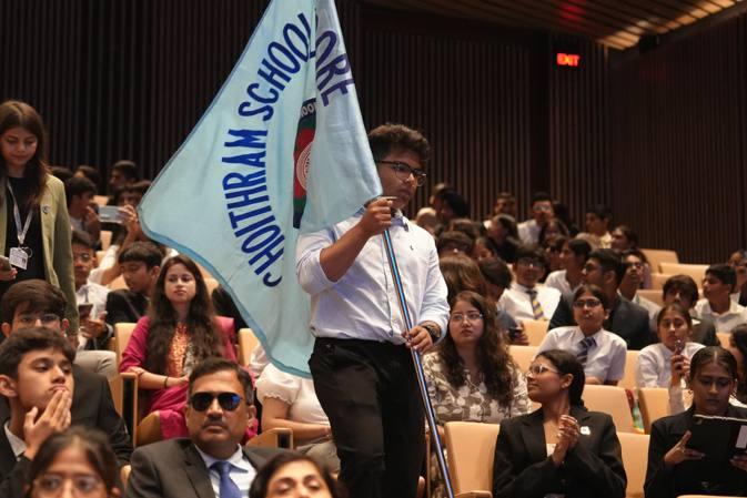 THE VALEDICTORY CEREMONY MARKED THE GRAND FINALE OF THE OXFORDMUN INDIA 2024, CAPPING OFF THREE DAYS OF INTENSE DEBATES, THOUGHTFUL DISCUSSIONS, AND INVALUABLE LEARNING EXPERIENCES. SIX EXCEPTIONAL STUDENTS FROM EACH COMMITTEE WERE HONORED AS BEST DELEGATES, OUTSTANDING DELEGATES, AND HONORABLE MENTIONS, RECOGNIZING THEIR OUTSTANDING CONTRIBUTIONS. AMONG THEM, SEVEN BEST DELEGATESWEREAWARDEDA100%SCHOLARSHIPTOTHEPRESTIGIOUSOXFORDMUNCONFERENCEINOXFORD,UK. ADDITIONALLY, FIVE WINNERS OF THE INNOVATION CHALLENGE RECEIVED A FULL SCHOLARSHIP ON THEIR REGISTRATION FEE FOR THE OXFORDMUN INDIA CONFERENCE. THE CEREMONY ALSO SAW EVERY DELEGATION TAKE THE STAGE WITH THEIR TEACHER COORDINATORS, PROUDLY CARRYING THEIR SCHOOL FLAGS, TO RECEIVE A SPECIALMEMENTOINRECOGNITIONOFTHEIRPARTICIPATIONANDEFFORTSINTHISINAUGURALCONFERENCE.
