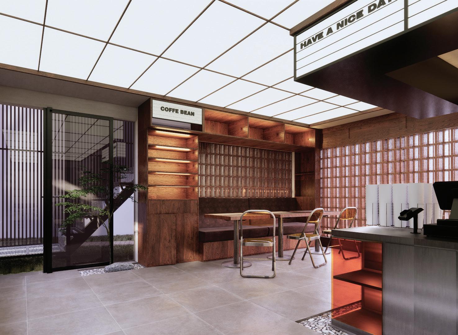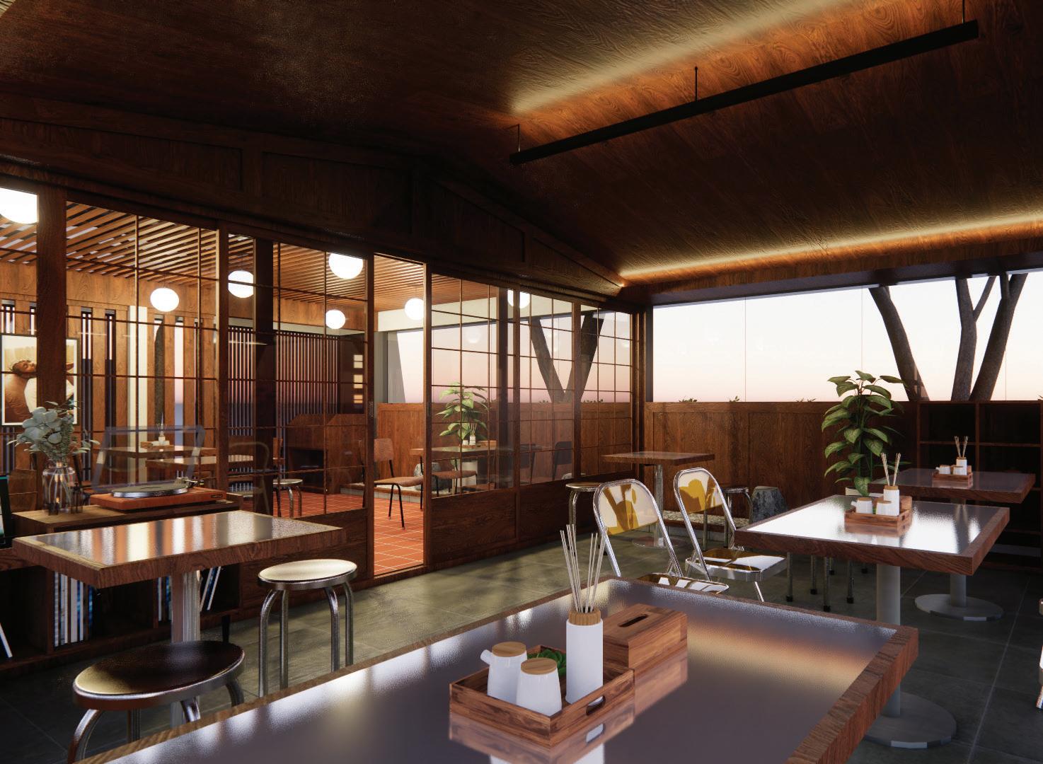 Meronavsi sebuah cafe di kawasan Sentul, Bogor dengan perpaduan gaya arsitektur modern dan japannese modern pada bagian interiornya. Klien mengharapkan adanya bukaan besar disetiap dinding agar menambah daya tarik pengunjung.