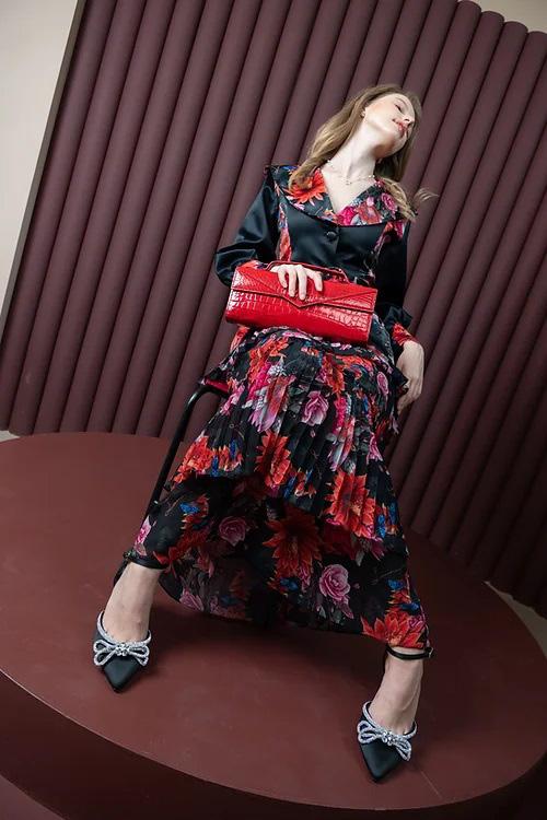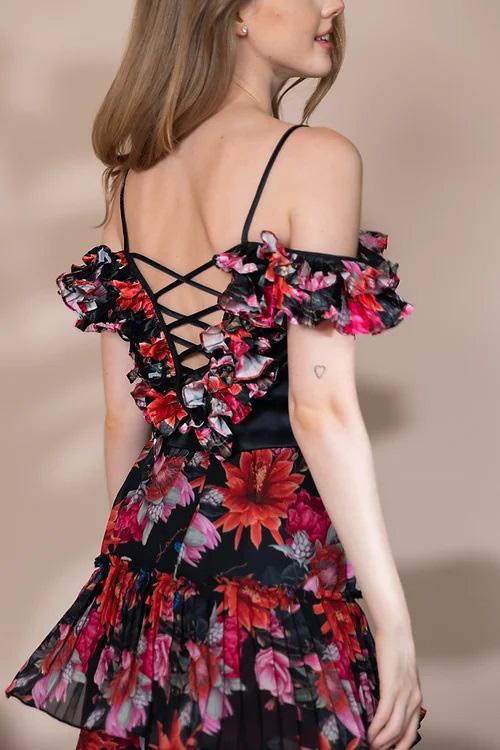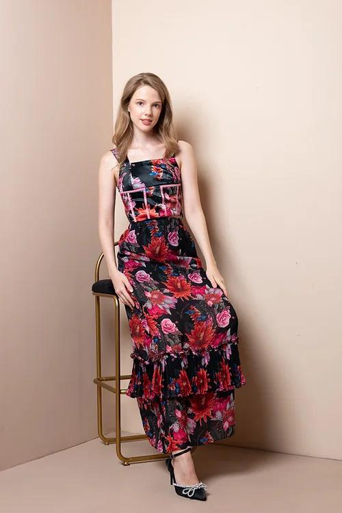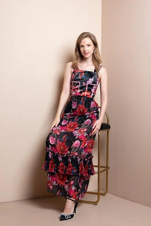 Delilah Wild Flower Print Ruffle Pleated Satin