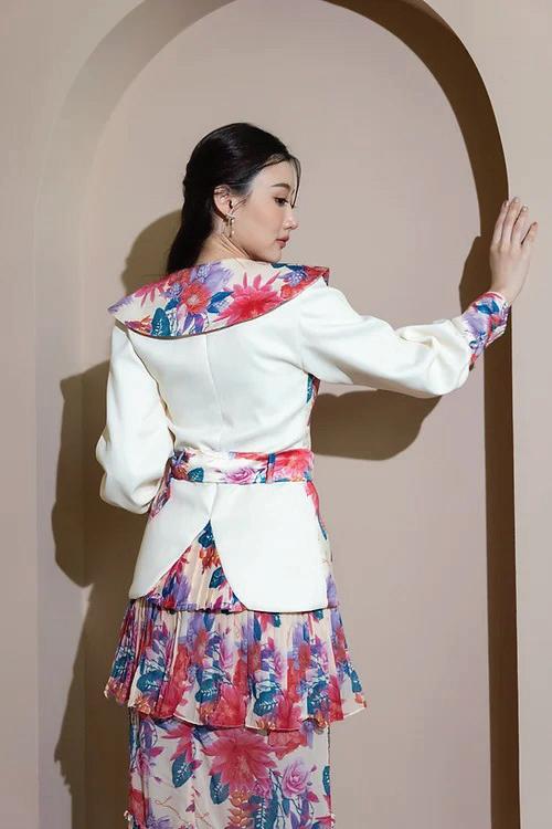 Wild Flower Suit Set Beautiful Wild Flowers Print on Satin Pleated Blazer Puffy Sleeves. Price 11,500 THB. (Creamy)