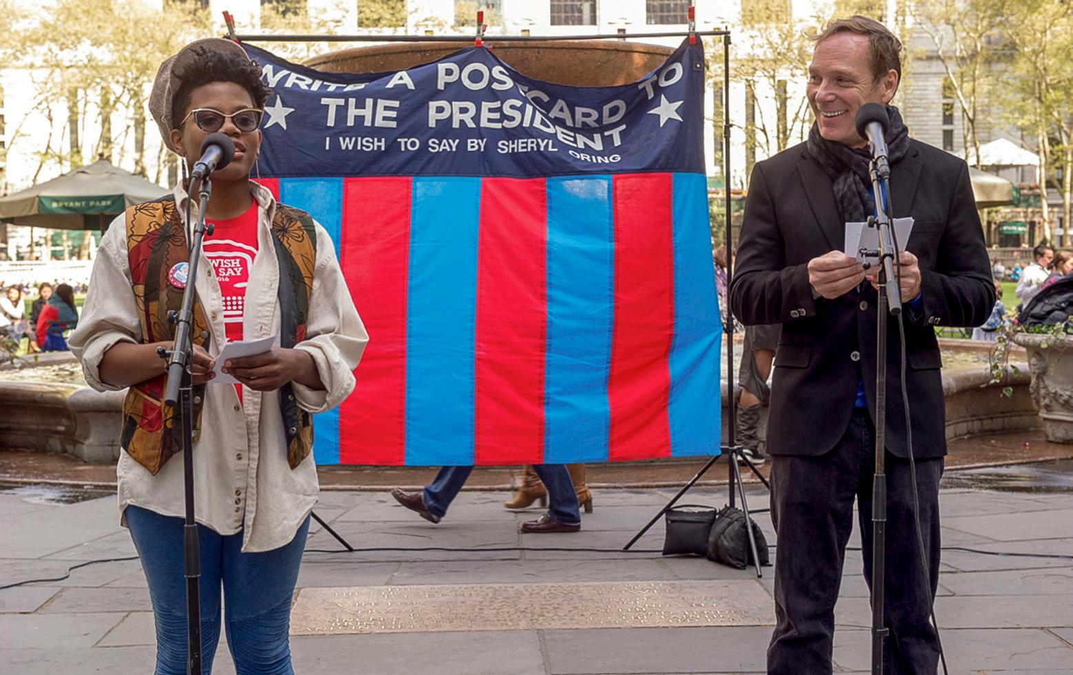 Oring has made other variations to I Wish to Say across the project’s extended duration. For example, in April of 2016 she brought dozens of students from the University of North Carolina Greensboro, where she was a faculty member, to perform in New York City. Fifty of her typists sat stationed around Bryant Park to take dictation in Oring’s largest singleday event. Performers also read the public’s postcards out loud throughout the day. In October of 2016 Oring visited Monmouth University and set up her office on the patio of the student center. The university’s community dictated postcards. Students turned