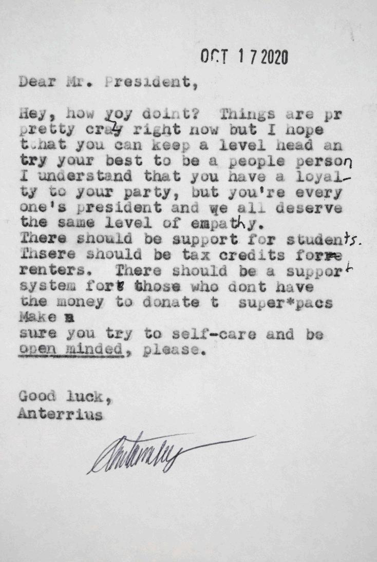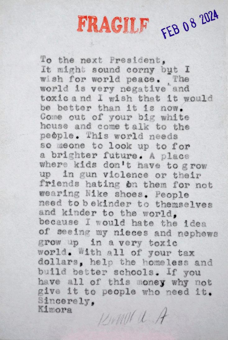 Talking to Humans. Another innovation of Oring’s undertaking is grounded in the humanto-human contact experienced in the typing of the message. Research continually demonstrates that people are more extreme in their messaging and contribute to a more polarized communication environment when they are “hidden behind the screen.” Communication through another person (the typist), enables this exhibit to create a communal, civic environment where polarization might be reduced and common ground might find a home, even through individually produced messages. Decades of relationship and friendship decline have accelerated with the advent of social media. In this context, talking to other human beings, particularly around political discourse, is a counter-cultural experience. Participation in this project is a chance for youth to practice this skill.