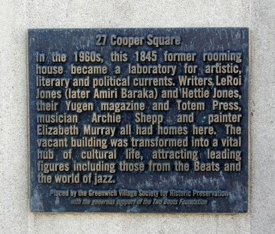 Hettie Jones ended up fighting developers until a deal was struck for them to construct a 23-story hotel around her building. The Cooper Square Hotel (now The Standard, East Village) opened in 2008, and eventually in 2017, a historic marker did go up. It reads: