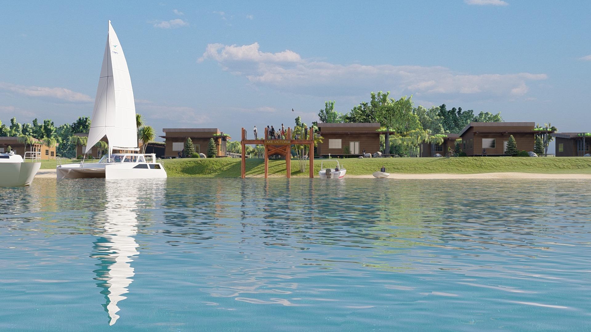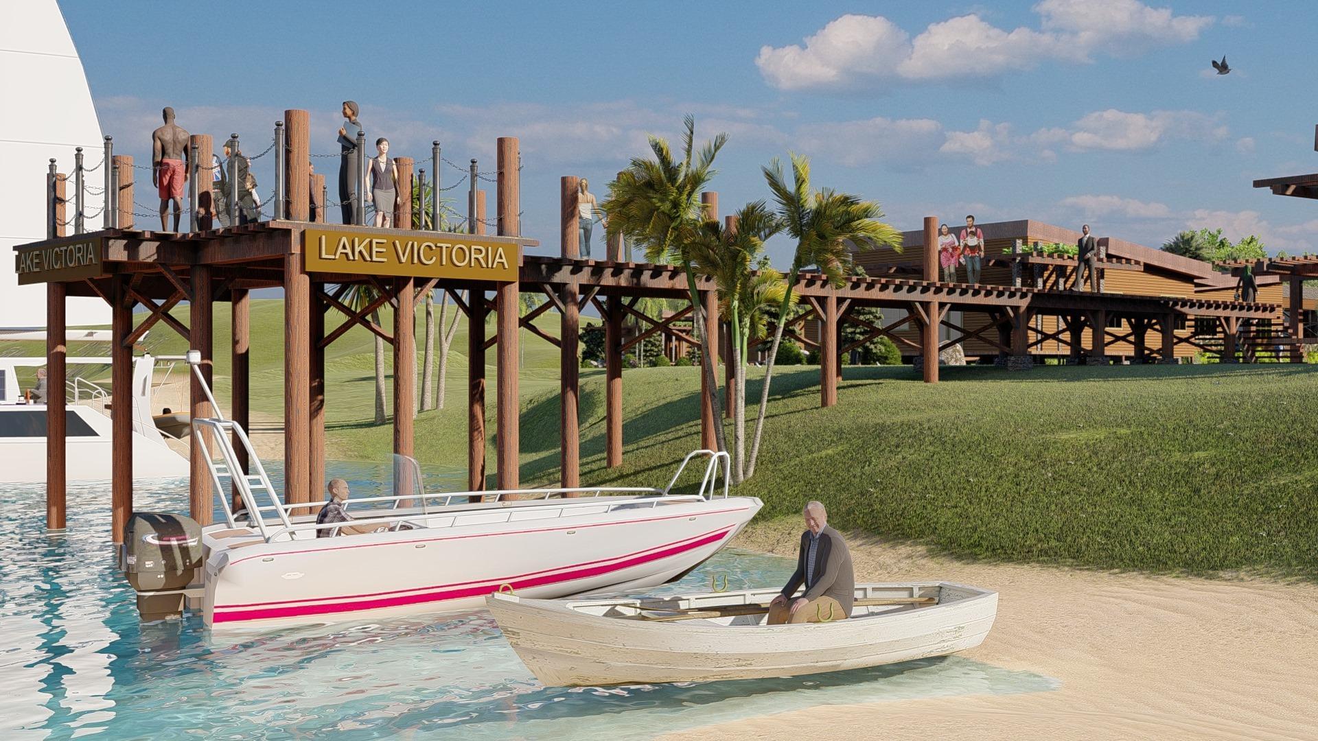 THIS MONUMENT SEEKS TO COMMUNICATE CONNECTIVITY - THE RESORT'S DESIGN CONCEPT. THE USE OF 3 CABLES/COLUMNS TO SUSPEND THE BOULDER SYMBOLIZES THE RESULTS OF COMING TOGETHER. THE CONCEPT SEEKS TO ENCOURAGE THE DISSOLUTION OF CONFLICTS BETWEEN THE FISHERS OF THE 3 EASTERN AFRICAN COUNTRIES YIELDED BY THE LAKE VICTORIA WATERS. JUST LIKE THE LAKE VICTORIA'S LAND BREEZES THAT COME TOGETHER & YIELD ONE OF THE LARGEST STORMS ON EARTH, FISHERS CAN WORK TOGETHER & CREATE MASSIVE ECONOMIC GROWTH.