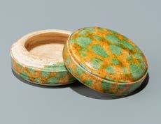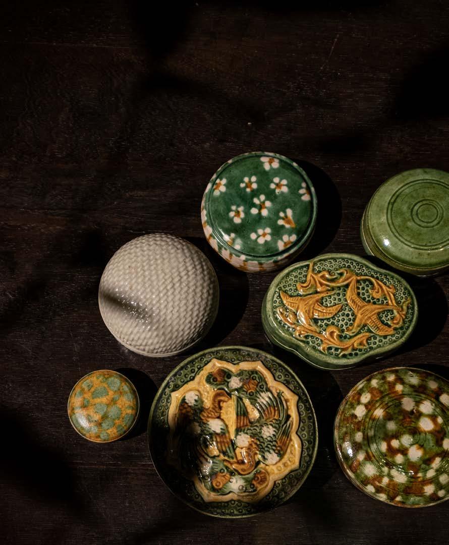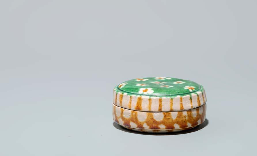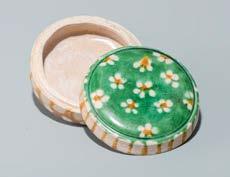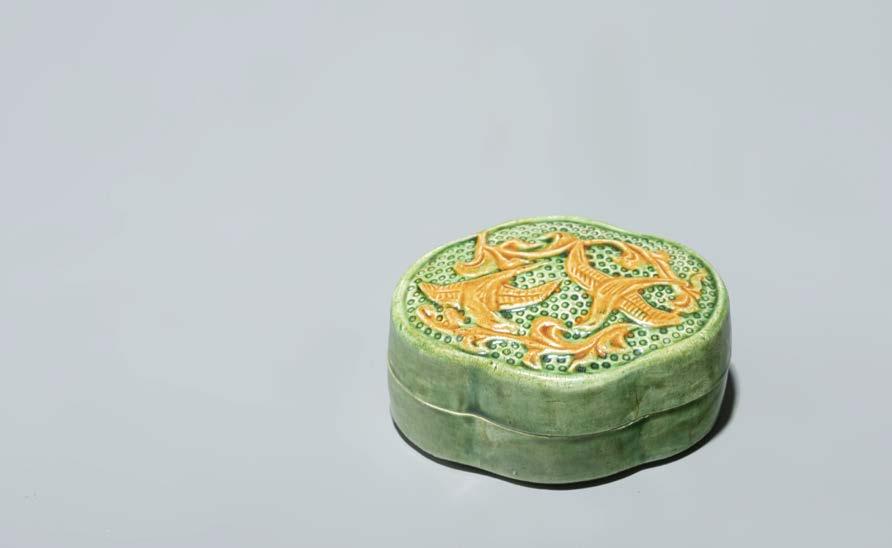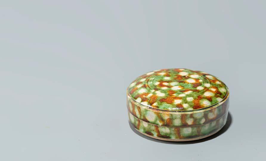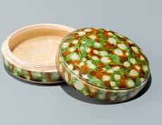 4045 唐代 三彩圓點香盒 直徑 8.7 高 3.8 公分 A Sancai Dot Incense Box, Tang Dynasty Diameter 8.7 Height 3.8 cm TWD: 50,000 RMB: 11,574 4046 唐代 三彩蓮紋孔雀香盒 直徑 10.9 高 4.8 公分;附供箱 A Sancai Peacock Incense Box With Lotus Pattern, Tang Dynasty Diameter 10.9 Height 4.8 cm; With box TWD: 50,000 RMB: 11,574 台灣重要藏家-阜春居主人珍藏 lot4037-4062