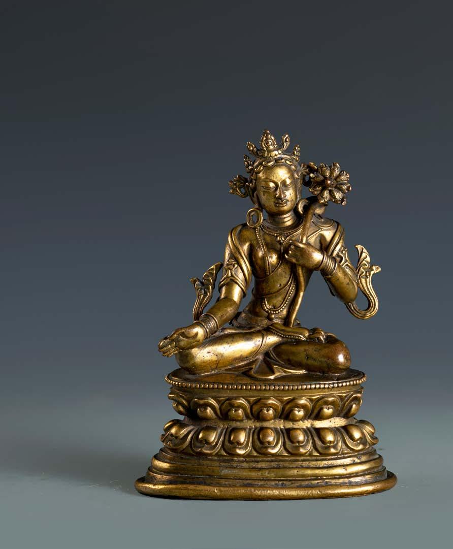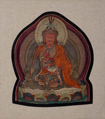 39 東京中央沐春堂 4035 清代 刺繡蓮花生大師 鏡框 長 45 寬 38 公分 來源:有容古美術專場-藏傳佛教珍品 An Embroidered Padmasambhava Frame, Qing Dynasty Length 45 width 38 cm TWD: 20,000 RMB: 4,630 蓮花生,印度僧人,烏仗那國人(今日的巴基斯坦 斯瓦特河谷一帶),以擅長咒術著名。八世紀應邀 入藏傳播印度金剛乘密法,創建西藏第一座寺院桑 耶寺,後被尊為藏傳佛教密宗的祖師寧瑪派祖師, 廣受供奉。 蓮師頭戴蓮冠,中有日月輪為飾,上方則是金剛杵 與羽毛,飾大耳璫,雙目圓睜,鬚眉卷曲,右手持 金剛杵,左手托嘎巴拉碗,碗中立一寶瓶,以跏趺 之姿端坐於蓮花寶座。 4036 明代 大明宣德年製款 銅鎏金 金剛鈴 高 22.5 公分 款識:大明宣德年製款。 A Daming Xuande Period Mark, Gilt Bronze And Diamond Bell, Ming Dynasty Height 22.5 cm TWD: 20,000 RMB: 4,630 有容古美術專場-藏傳佛教珍品 lot4027-4035