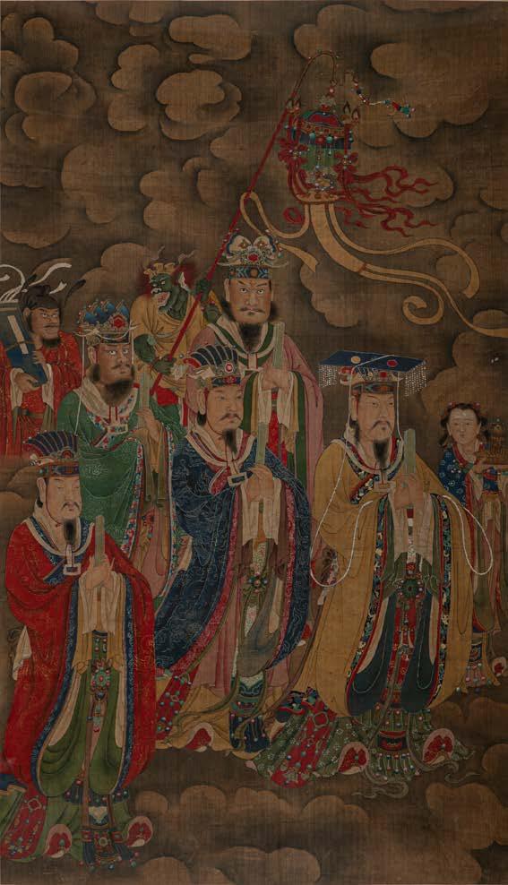 28 4025 明代 五天尊立像 重彩設色 鏡框 長 115.5 寬 65.5 公分 著錄:《中國佛教寺廟寶藏-格物》,展 品8,44-47頁,藏新藝術有限公 司,2020 Five Standing Statue , Ink And Color On Silk, Framed, Ming Dynasty Length 115.5 Width 65.5 cm TWD: 180,000 RMB: 41,667 本件為明代中期水陸畫系統之一,按畫 面五位帝王式的配置可看出,應為十王 圖之一。畫面後方立有兩位侍從,其一為 紅髮青面差使,咧嘴呲牙,雙手掌幡, 另一黔面黑髯差使,頭戴黑帽,手捧藍 冊,容或為生死簿。早期筆者僅能從畫 冊中看到南宋時代的十王圖,按序共分十 軸,可能為寧波畫匠陸仲淵等人所繪, 現存於日本博物館及美國博物館中。 現存傳世最完整的一套水陸畫非山西寶 寧寺莫屬,保存完整且年代較早,應為 明早期,為現今學者研究水陸畫時的重 要文獻。展品與寶寧寺藏的風格、畫工 及年代相似,畫面中諸位帝王所戴冕弁各 異,身著錦衣,開臉修長,雙目有神, 用色華麗而協調,背景則黑雲繚繞,佈 局平穩,與寶寧寺所藏不分軒輊。應真 藏典藏水陸畫系統嚴謹,凡庸之作必然 裁汰,而此十王圖立軸保存良好,工藝 設色皆優,宜展宜藏。