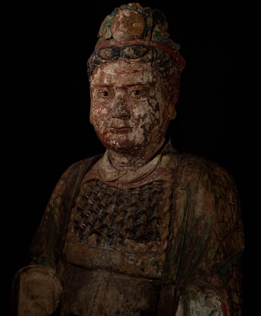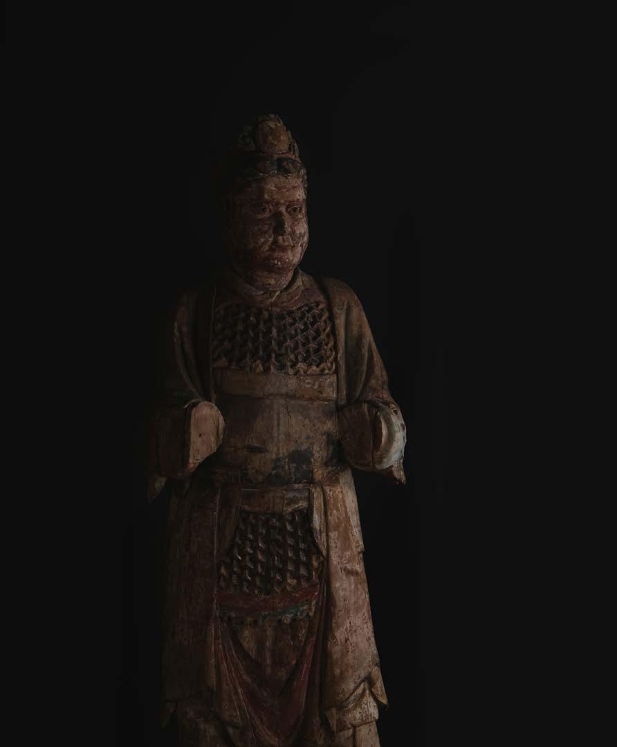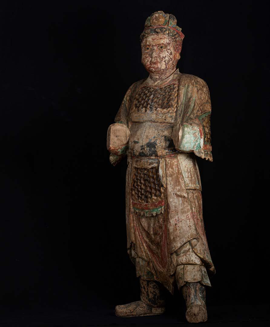 4015 明代 武將立像 高 143 公分 A Military Statue, Ming Dynasty Height 143 cm TWD: 400,000 RMB: 92,593 此件武官立像尺寸巨大,風格自然寫實,盡展 工匠技術純熟。其人物面部表情刻畫柔和莊 重,自然流露出仁慈內斂、寧靜平和的神韻。 觀其人物服飾,內著甲胄與裙,外罩帔,長裙 大袖,衣擺層次分明,以系帶系結,頭戴玄冠, 足穿靴,以細節體現工匠精湛技藝。此類衣著 風格當屬典型明朝高級武官服飾。 明洪武十六年,始定冠冕制度,至洪武二十六 年時又做過補充修改。明制取法唐宋,唐宋則 源襲於漢。長服寬袖,佩綬,戴冠冕,皆屬漢 朝官服制式。中國冠冕之制,自漢代以來歷代 沿襲,源遠流長。明代大型人物造像非常稀 少,且多以宗教人物為題材,大多尺寸較小, 並多見坐像。此件實屬難得,適合作為收藏陳 設。
