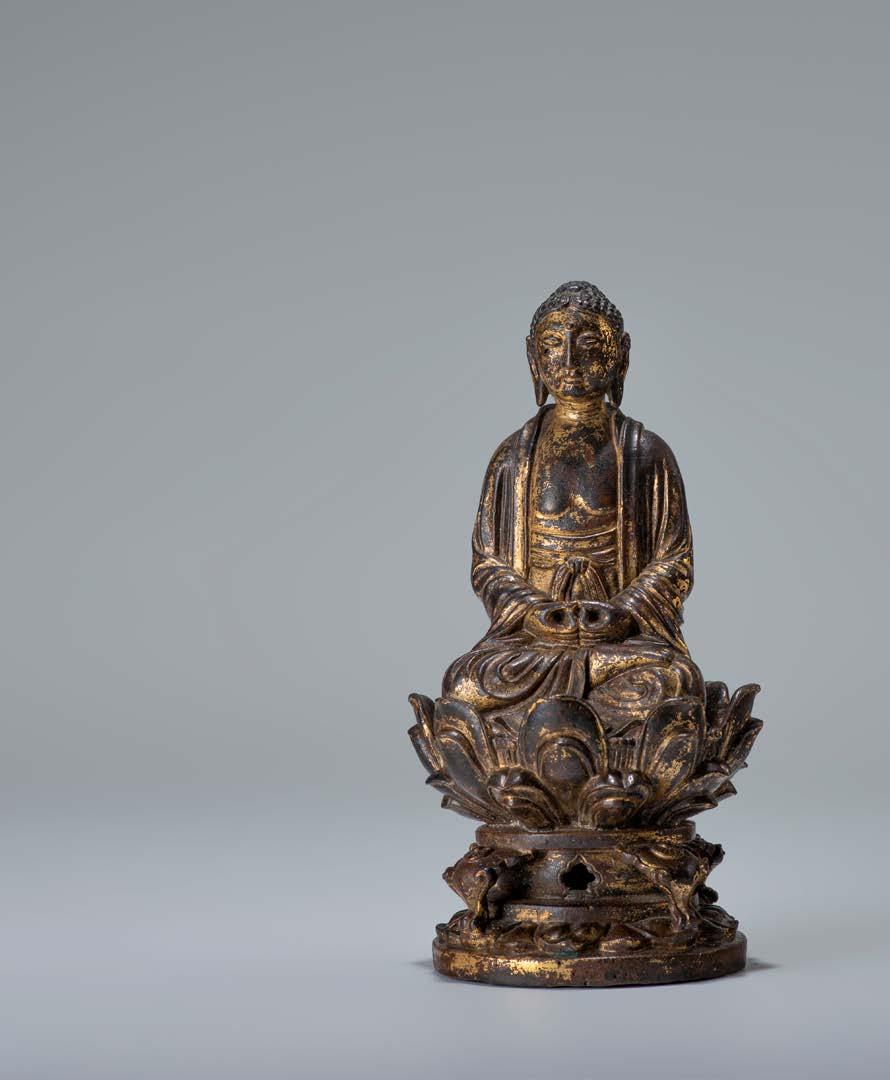 4019 遼代 大日如來鎏金佛坐像 高 14.7 公分 A Great Sun Tathagata Gilded Buddha Seated Statue, Liao Dynasty Height 14.7 cm TWD: 250,000 RMB: 57,870 此像頭飾螺發,頭頂有肉髻和髻珠, 臉龐圓潤飽 滿,結跏趺端坐,上身明顯偏長。上身袒露胸口, 外披雙領下垂式袈裟,下身著僧裙,腰間束帶並露 出蝴蝶結。衣紋表現非常簡潔,可見明顯的衣褶, 也突出了軀體和肌肉的自然起伏與變化。雙手置膝 上,拇指與五指相觸虛臥,手印極為特殊。 身下承以束腰式蓮花座,蓮座上層飾雙層仰蓮,下 層為單層覆蓮,中間有寶相折葉。這些特徵生動寫 實,清新自然,具有遼金時期北方地區造像的鮮明 特點,在遼金時期中原北方寺廟的塑像和壁畫上可 以看到大量相似的例證,具有重要的藝術、收藏和 研究價值。