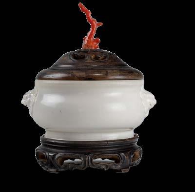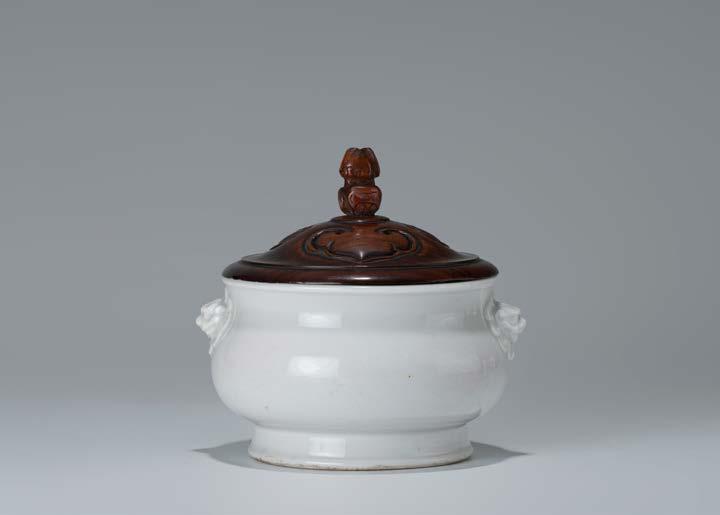 4010 清代 原木蓋 德化獅耳爐 直徑 12.9 高 7.8 公分;含蓋高 13 公分;附供箱 A Log Cover Dehua Lion Mask Handles Burner, Qing Dynasty Diameter 12.9 Hight 7.8 cm, 13 cm in height with lid; With box TWD: