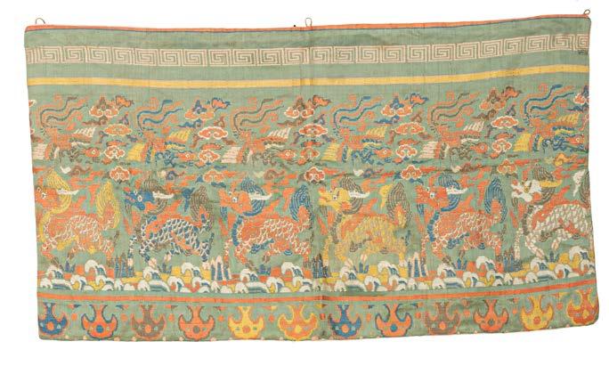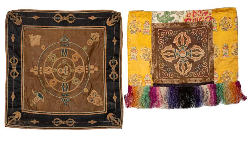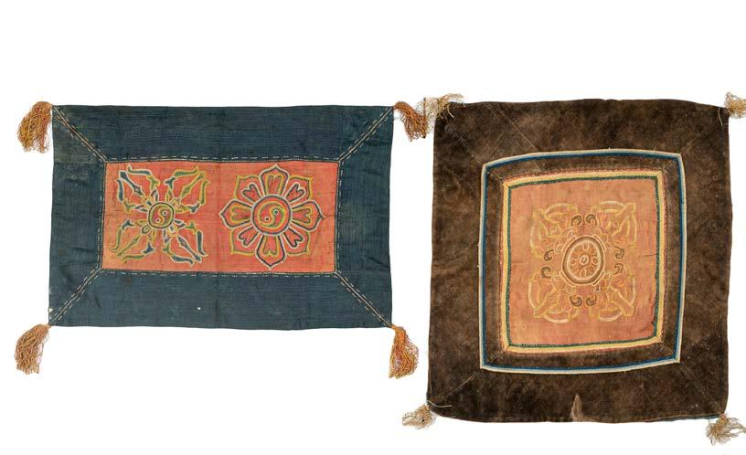 37 東京中央沐春堂 4033 清代 刺繡 五件一組 長 22.5 寬 34.5 公分;長 32.5 寬 57.5 公分;長 30 寬 32.5 公 分;長 42.5 寬 42.5 公分;長 39.5 寬 35 公分 An Embroidery Set of five, Qing Dynasty Length 22.5 width 34.5 cm; length 32.5 width 57.5 cm; length 30 width 32.5 cm; length 42.5 width 42.5 cm; length 39.5 width 35 cm TWD: 50,000 RMB: 11,574 五件刺繡織品,圖案分別為祥獸麒麟、藏傳法器與符 號。 麒麟為中國古代神話傳說中的神獸。金剛杵,是諸佛最 重要的持物,代表堅守不變,可摧破一切無知愚昧,為 「慈悲」的象徵。十字金剛杵,由四個帶蓮座的金剛杵 組成,象徵絕對的定力。法輪,共有八軸,代表佛法八 正道,象徵佛陀「圓融教化」。寶蓮,出淤泥而不染之 純潔象徵,表示純淨與斷滅。 有容古美術專場-藏傳佛教珍品 lot4027-4035