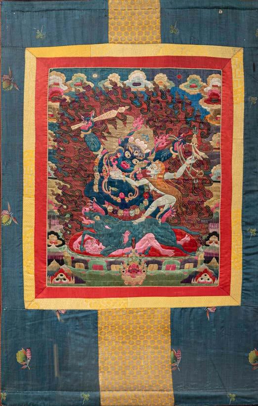 38 4034 19世紀 藏東 閻魔天刺繡唐卡 鏡框 長 87 寬 52.5 公分 An Eastern Tibet Yan Motian Embroidered Thangka Picture Frame, 19th Century Length 87 Width 52.5 cm TWD: 50,000 RMB: 11,574 閻魔天,梵語Yama,西藏八大護法之一, 負責藏人生死與六道輪迴的判官,在地獄 幫助亡靈面對死亡。藍膚、牛頭、人身, 三眼怒目,豎髮衝天,頭戴五髑髏冠,左 手持金剛套索,右手持骷髏頭魔杖,胸前 佩掛人面頭顱項鍊與一條赤蛇,足下踏著 一隻藍牛,牛底下方有一女子。紅色髮絲 與熊熊火燄則象徵狂暴冤恨與心靈燃燒的 怒火。 閻魔天身旁閻妹(Yami),左手捧著嘎巴 拉,右手高舉三叉戟,兩人並稱「雙王」, 象徵意味著女性智慧與男性慈悲接觸的最 初階段。 本件唐卡為十九世紀的刺繡唐卡,繡工細 緻,色彩飽合度高,層次分明,原裝原裱, 保存完整,實屬難得之精品。 lot4027-4035