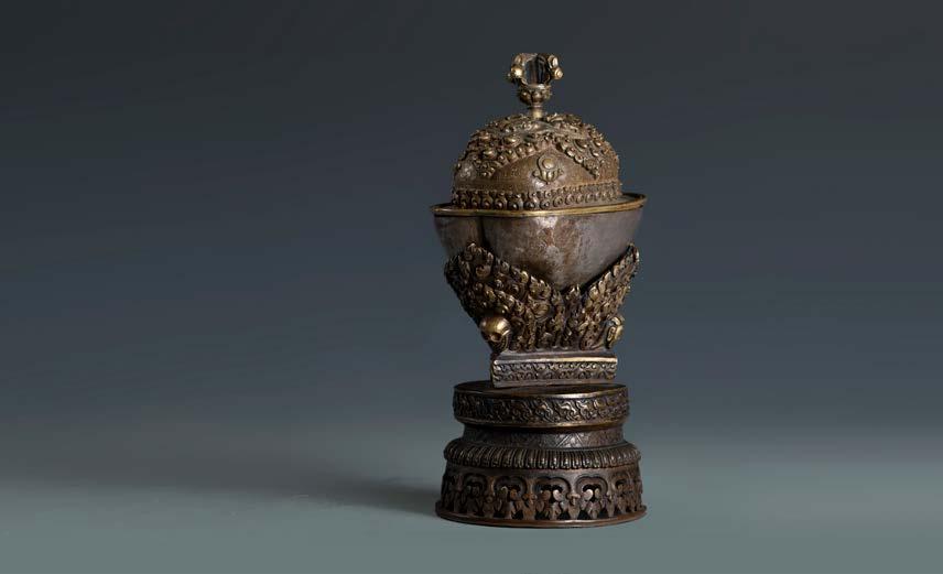 東京中央沐春堂 4032 18世紀 銀製嘎巴拉碗 高 17.5 公分 A Silver Gabala Bowl, 18th Century Height 17.5 cm TWD: 30,000 RMB: 6,944 嘎巴拉屬於密宗重要的法器之一,象 徵大悲與空性。多以人顱骨橢圓形的 上半部所製成,是為數眾多的金剛乘 神靈的供器、飯碗或祭祀用碗,瑜伽 師、大成就者、空行母、本尊神與護 法神的左手都持有嘎巴拉碗。 4031 18世紀 銀製佛盒 長 10 寬 7.3 高 13 公分 A Silver Buddha Box, 18th Century Length 10 Width 7.3 Height 13 cm TWD: 20,000 RMB: 4,630 本件為銀製佛龕式嘎烏,正面鏨刻減地卷草紋,以及藏傳佛教傳統八寶紋飾: 寶傘、寶罐、法螺、寶幢、法輪、吉祥結、蓮花、金魚。嘎烏兩耳處有繫帶環, 外繫布帶,用以隨身攜帶。嘎烏盒鏨刻精細,塑造立體,品相保存完好,是一 件難得的精品。 嘎烏是藏族的護身佛盒,用來盛放 聖物和其他物品,具有私人佛龕的 功能。 此件為銀製嘎巴拉碗,由碗蓋、 碗體及碗托三部分組成,碗蓋 浮雕並鏨刻纏枝花卉紋,碗托 三面以火燄紋和人頭為飾,底 座共有五層,整體顯得高聳有 致,做工精緻,華麗且莊嚴。 有容古美術專場-藏傳佛教珍品 lot4027-4035