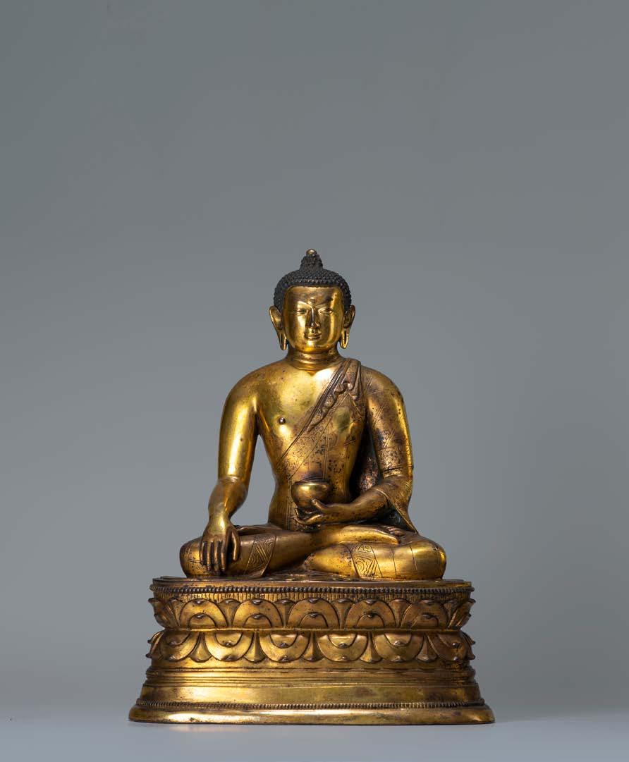 4028 18世紀 銅鎏金釋迦摩尼佛像 高 29 公分 A Gilt Bronze Shakyamuni Buddha Statue, 18th Century Height 29 cm TWD: 800,000 RMB: 185,185 釋迦牟尼是古印度北部迦毗羅衛國的太子,創立舉世聞名的 佛教。佛祖左手結定印捧缽,表示「禪定」之意;右手結觸 地降魔印,表現出釋迦牟尼降魔成道故事的「成道相」,結 跏趺坐於仰覆蓮瓣寶座。 本件神態慈祥柔和,圓面大耳,頭飾螺髮與肉髻,鼻子高挺, 面容莊敬肅穆,圓潤的雙肩與細腰形成強烈的對比,肌肉線 條飽滿有力。身著袒右肩百衲袈裟,左肩衣褶呈蜿蜒曲線, 衣緣雕刻簡潔流暢的花紋,顯得典雅而樸實。 此尊銅鎏金釋迦牟尼佛為內蒙古Zanabazar札那巴札爾學院 鑄造,造像風格華麗寫實,鎏金厚實色澤飽滿,有如鏡 面拋光般細緻,璀璨奪目,熠熠生輝。 lot4027-4035