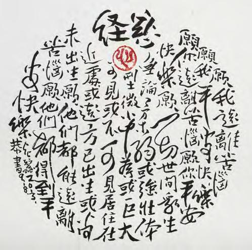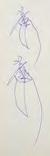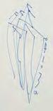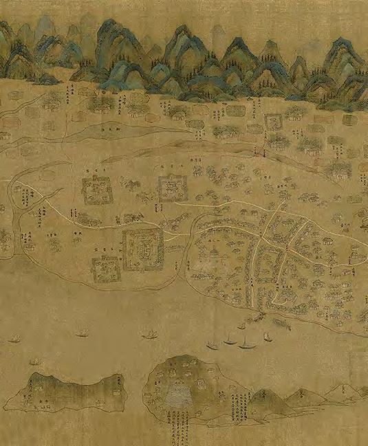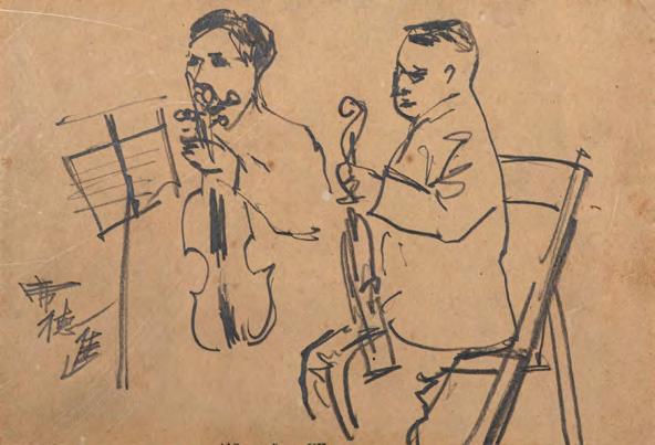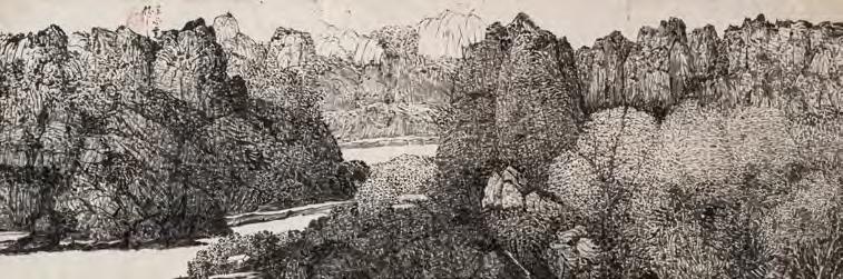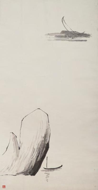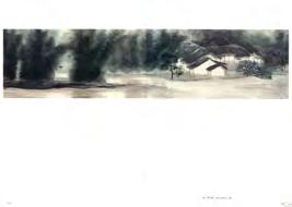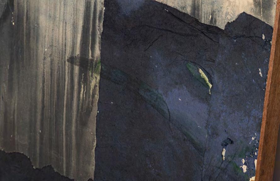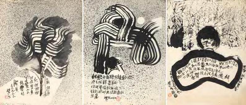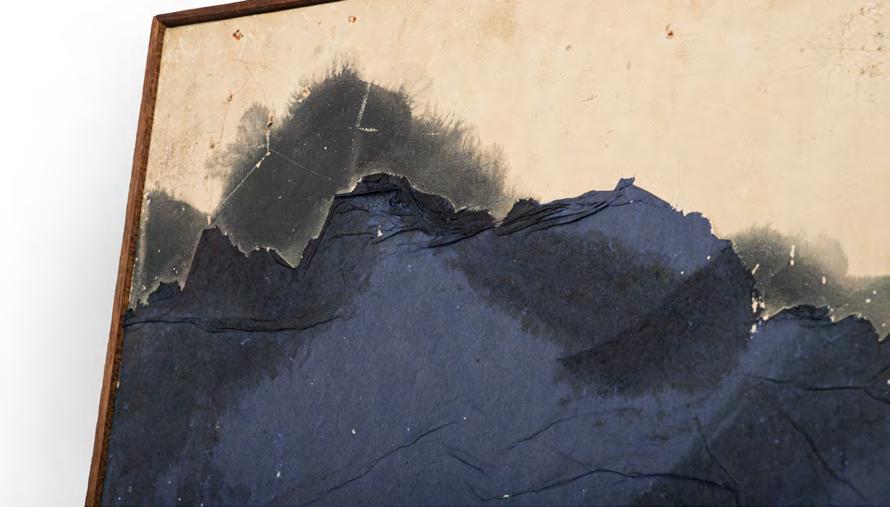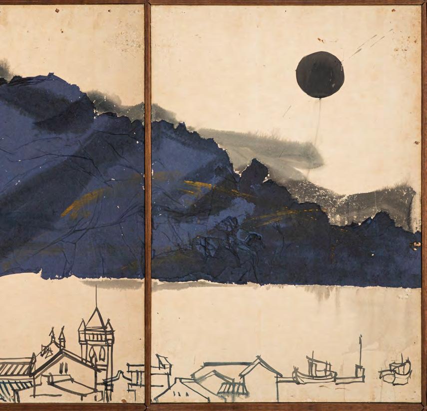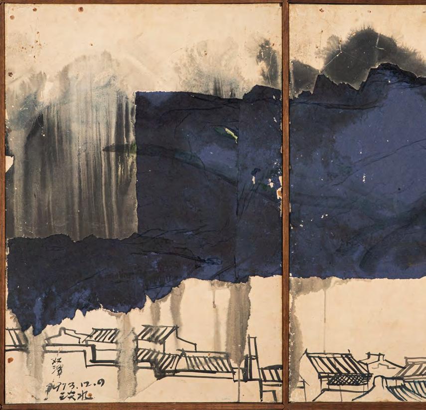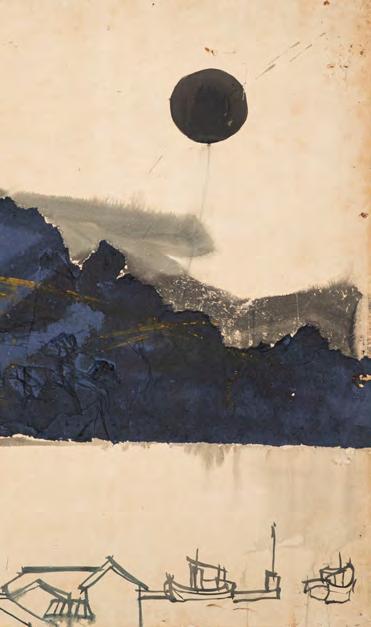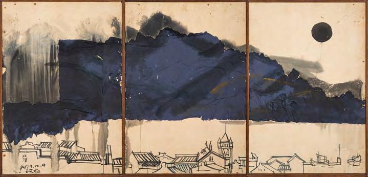 《觀音山》採三聯屏結構,上半部則以深藍與墨色的大塊面量構成觀音山,紙面上可見撕貼、壓痕與層層重 疊的痕跡,使山體化為一個壓縮後的重量,以紙張材質表現細節。山與街屋之間留下一道明確的分界。只有重 量下半部的線條明快,線條之間有間隔與呼吸,整體帶著音樂性的律動,像席德進淡水素描留下的節奏:教堂 塔樓、屋脊斜度、船隻的 杆,都只用幾筆就交代清楚,但彼此之間的節奏很接近,或有一種音樂性。