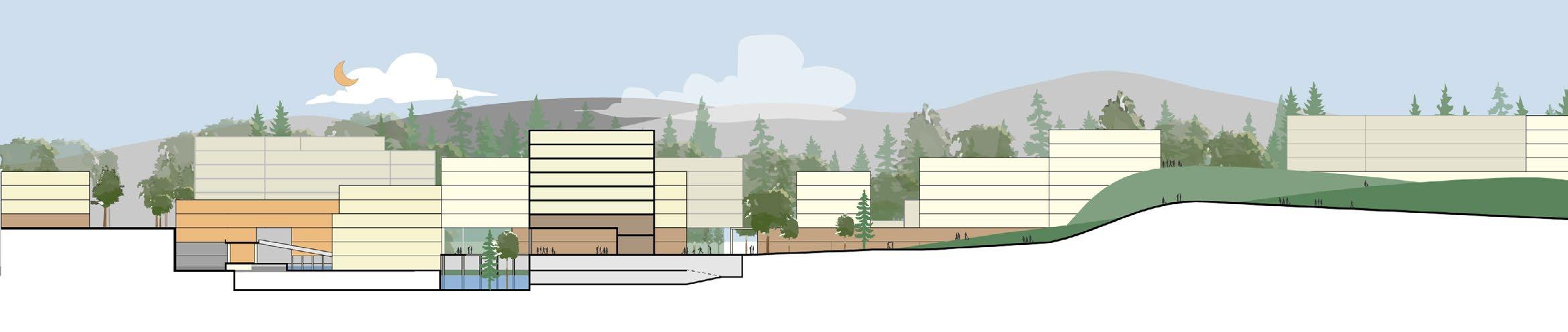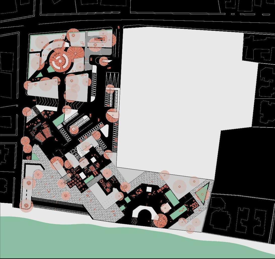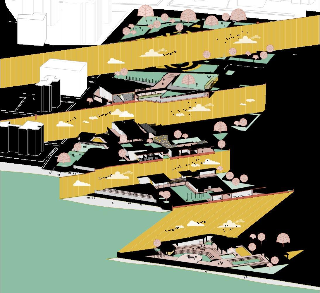 Canopy grounds enclose various terraces tucked into skyscrapping evergreen tree. These terraces hold mixed used functions embroidered amongst the existing fabric with interesting details of ramps and mobility networks.