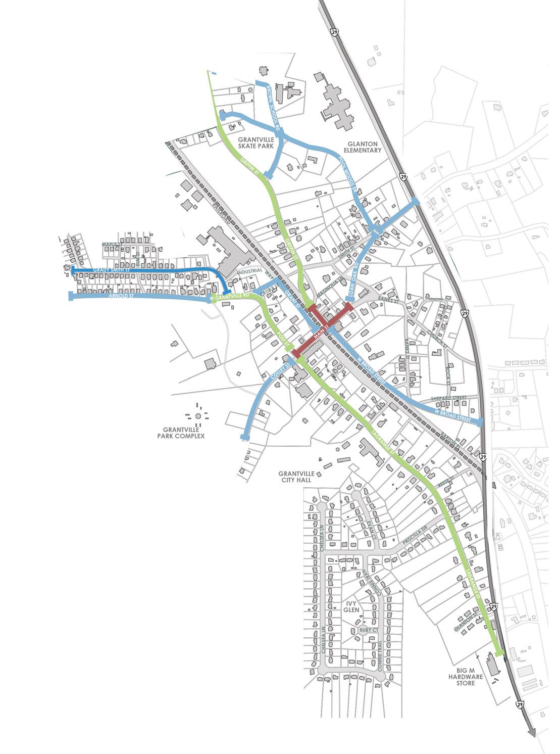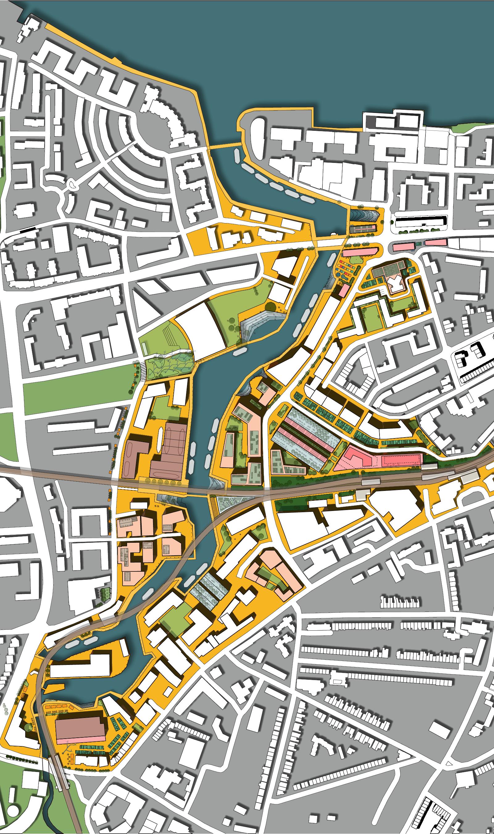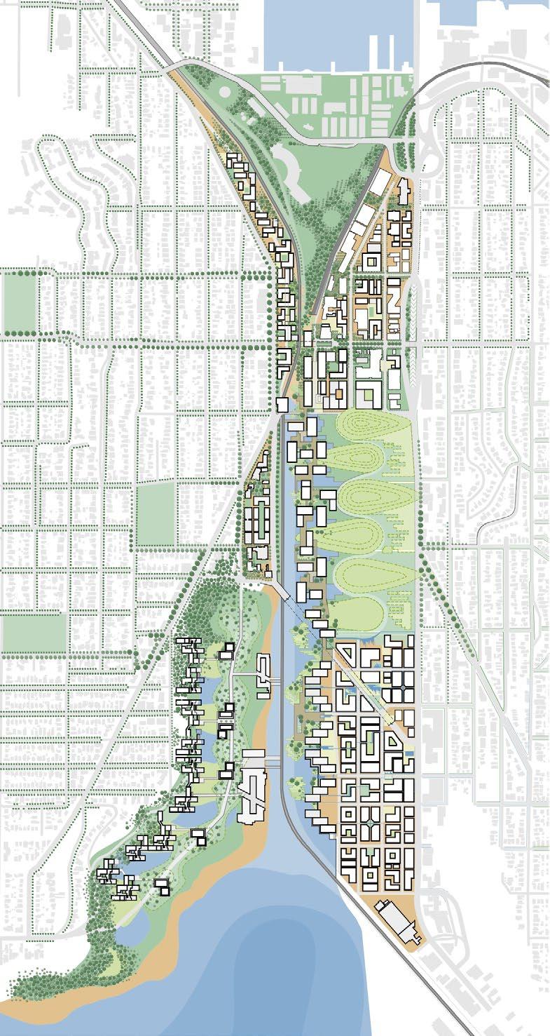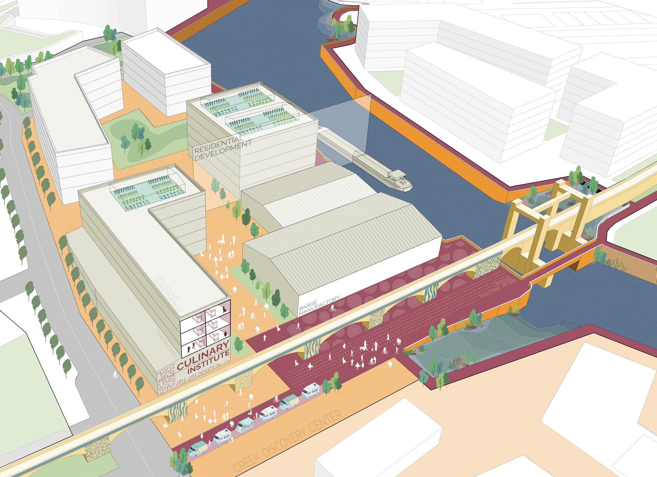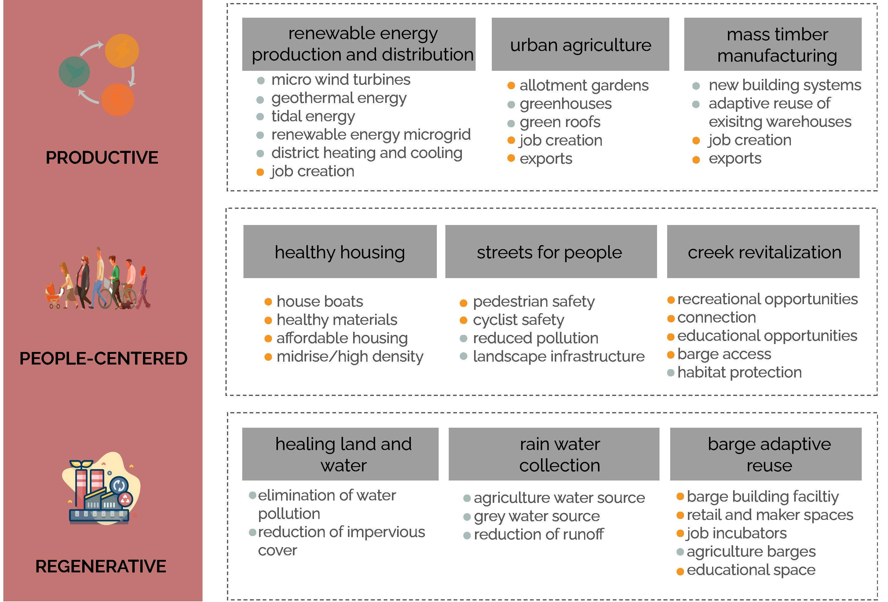 key intervention sites creek walk renewable energy urban agriculture housing greenspace green street manufacturing creek habitat area barge / houseboat