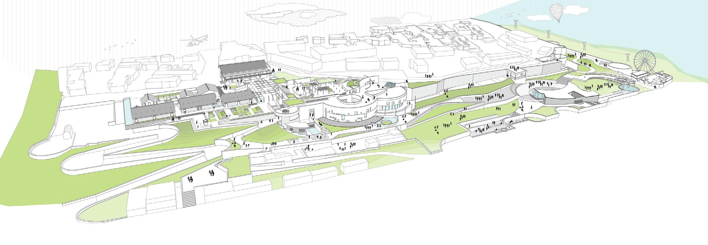 leaving aside 4 acres for future expansions. The rest 8 acres opens a transition area from the built context to the sea.