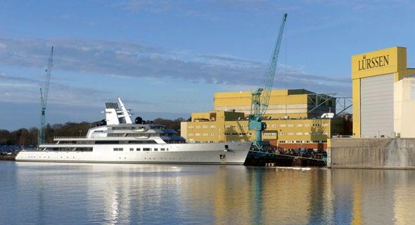 (PROJEKT ALIBABA) DIE LÜRSSEN-WERFT VERLASSEN. DAS KRAFTVOLLE UND DOCH ELEGANTE AUSSENDESIGN STAMMT VON GERMÁN FRERS; DIE INNEN- UND AUSSENBEREICHE WURDEN VON NAUTA DESIGN GESTALTET.