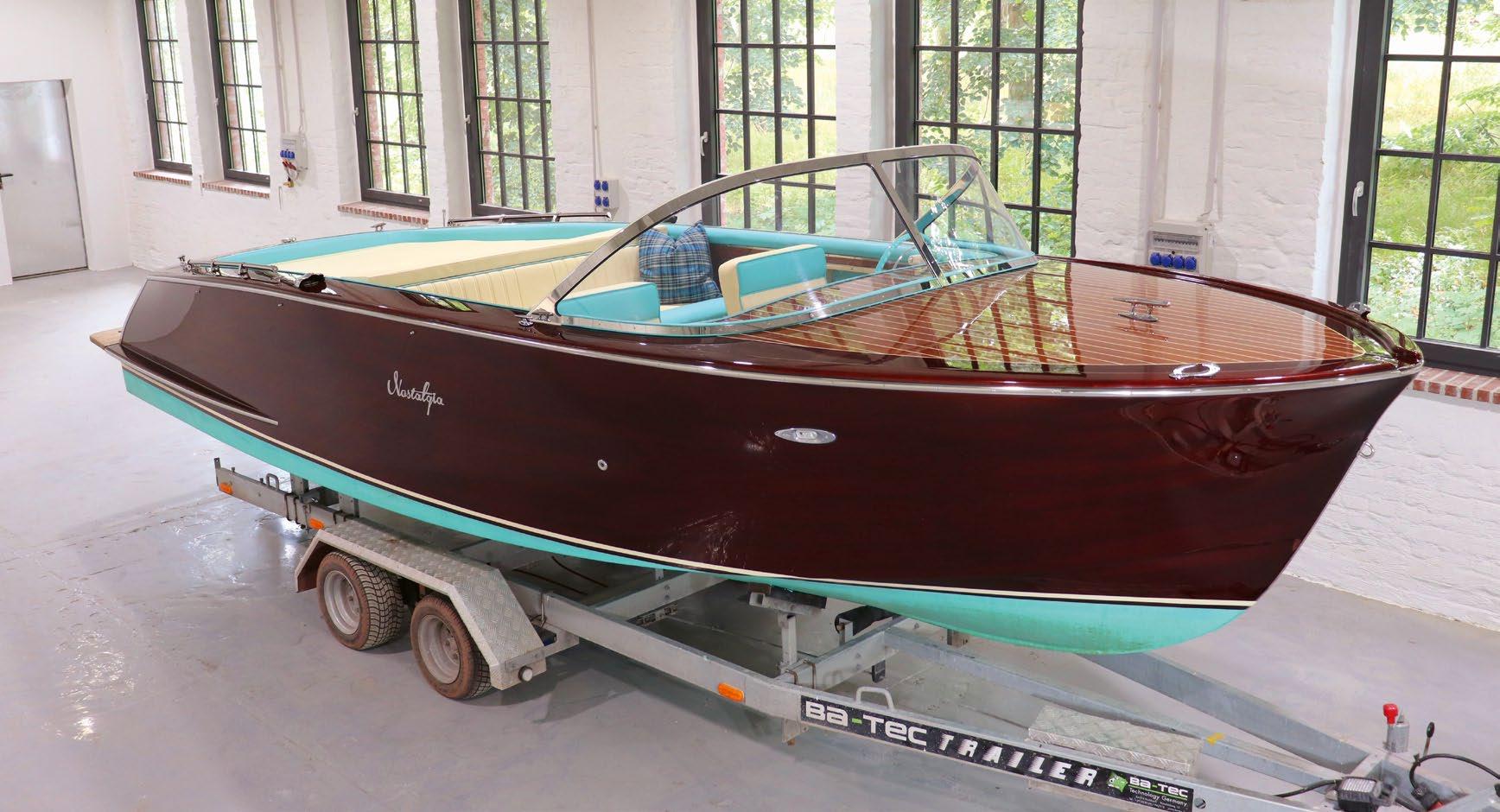 Wie gern würde so mach einer selbst auch einen der schönen Holzboot-Klassiker sein Eigen nennen. Wenn da nur nicht die viele Arbeit wäre: schleifen, lackieren und nochmals schleifen und lackieren. Und immer schön darauf achten, dass das Holz, wenn das Boot an Land ist, nicht zu sehr austrocknet, und dass es, wenn es im Wasser ist, nicht unkontrolliert Wasser zieht, wenn beispielsweise beim Cruisen die oberen Plankenstöße (durch die Sonne am Liegeplatz) geschrumpft und die Fugen sich dadurch etwas geöffnet haben… Mike Trenner kennt das Problem und weiß Abhilfe: seine edlen, konsequent auf Klassiker der 50er Jahre getrimmten Neuboote zwischen 5,80 und 8,30 Meter Länge fertigt er aus praktischem, widerstandsfähigem und vor allem: pflegeleichtem GfK. Trotzdem sehen sie von weitem – und sogar bei genauerer Betrachtung – aus wie aus edlem Mahagoni gefertigt. Möglich macht das eine spezielle Laminiertechnik, bei der das MahagoniDesign unterhalb des Gelcoats eingearbeitet wird. Sogar Stösse wie bei „echten“ Holzbooten werden gekonnt imitiert. Eine Rundum-Lackierung für das größte Modell, die Mare 830, ist für rund 6.000 Euro zu haben. Sparfüchse bestellen den Rumpf in Uni-Lackierung.