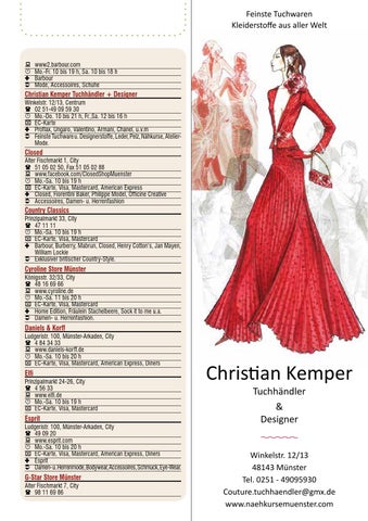 Christian Kemper Tuchhändler & Designer Winkelstr. 12/13 48143 Münster Petra Oberthür Tel. - 49095930 Bergstr. 750251 (neben dem Kiepenkerl) 48143 Münster Couture.tuchhaendler@gmx.de Tel. 02 51.9 81 61 13 www.naehkursemuenster.com