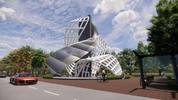 Terinspirasi dari bentuk daun untuk merespons site sekitar yang banyak pepohonan dan dimanfaatkan sebagai area solar panel dengan sudut 90 derajat akan maksimal tersalurkan energi panas.