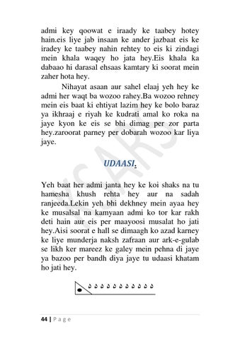 UDAASI. Yeh baat her admi janta hey ke koi shaks na tu hamesha khush rehta hey aur na sadah ranjeeda.Lekin yeh bhi dekhney mein ayaa hey ke musalsal na kamyaan admi ko tor kar rakh deti hain aur eis per maayoosi musalat ho jati hey.Aisi soorat e hall se dimaagh ko azad karney ke liye munderja naksh zafraan aur ark-e-gulab se likh ker mareez ke galey mein pehna di jaye ya bazoo per bandh diya jaye tu udaasi khatam ho jati hey. ۵۵۵۵۵۵۵۵۵۵۵