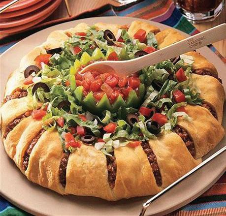 Arrange crescent rolls on a 12-in pizza pan, forming a ring with pointed ends facing the outer edge of pan and wide ends overlapping.