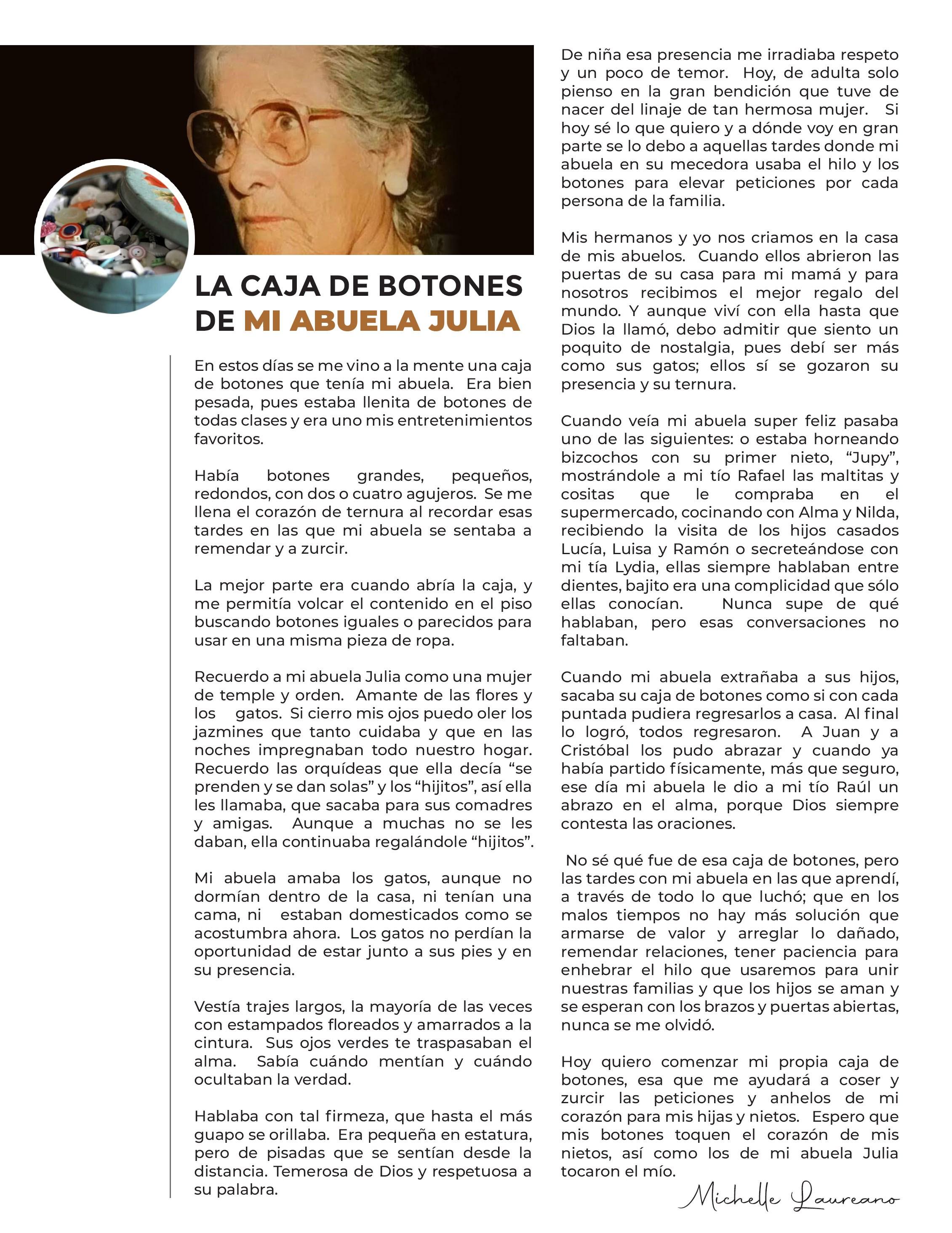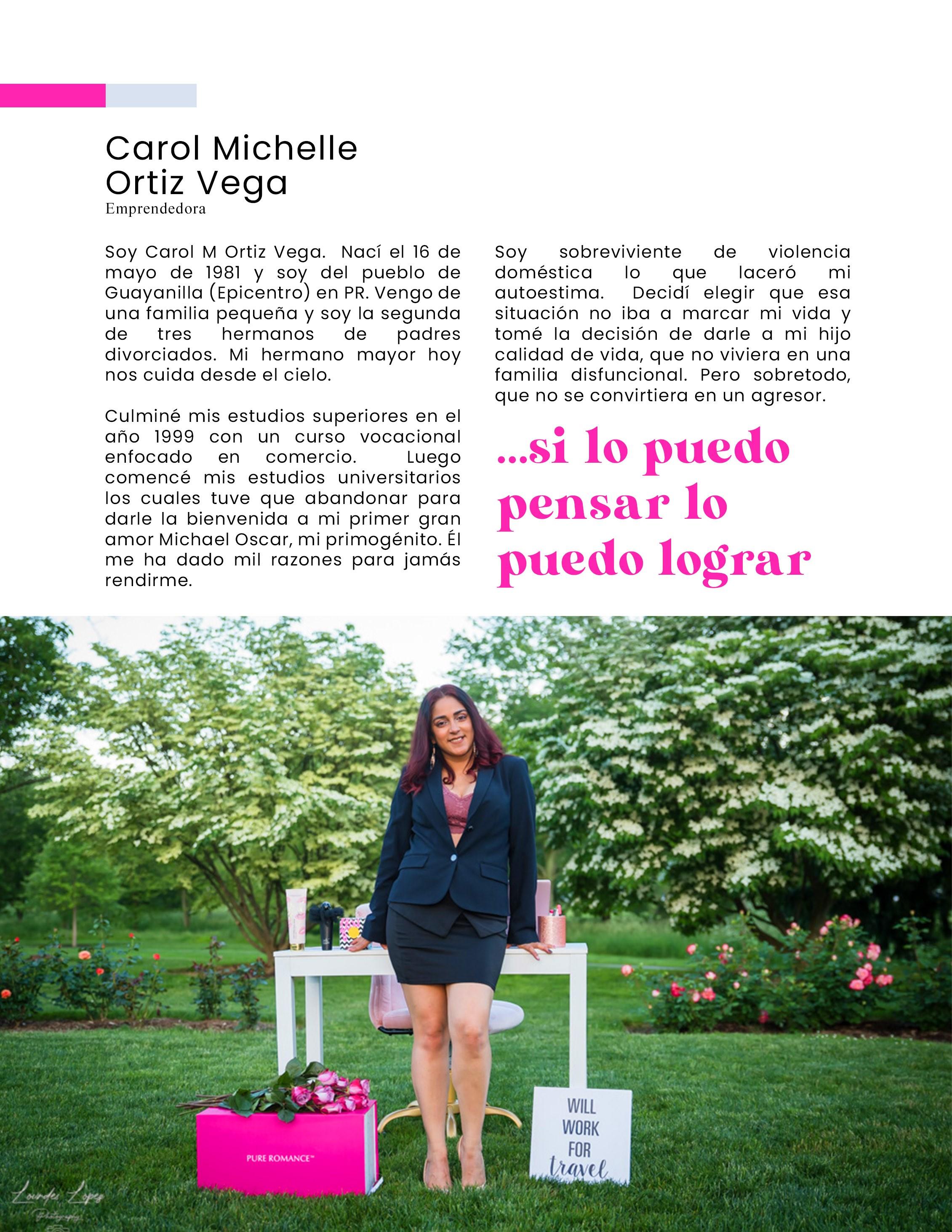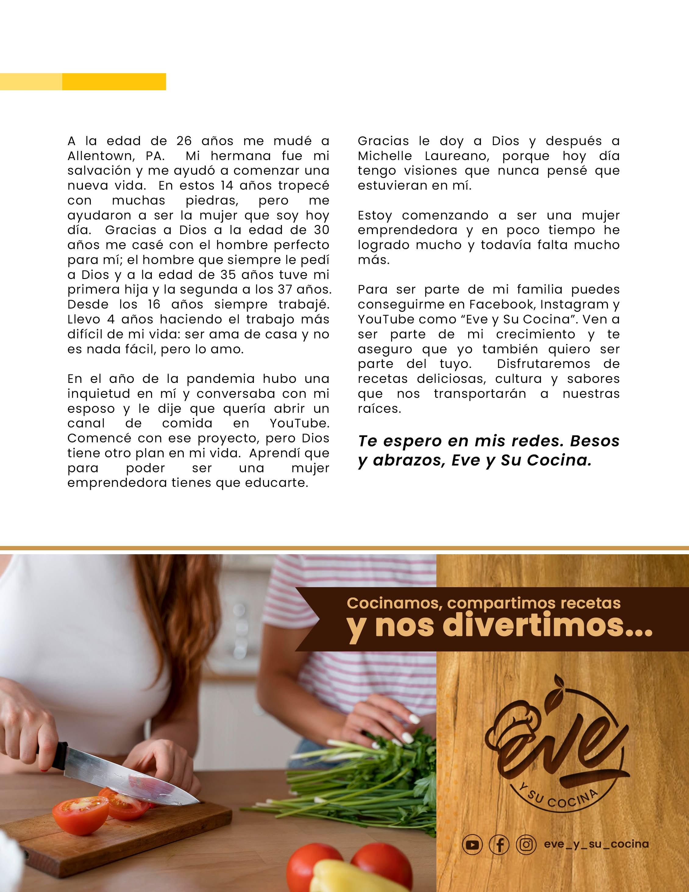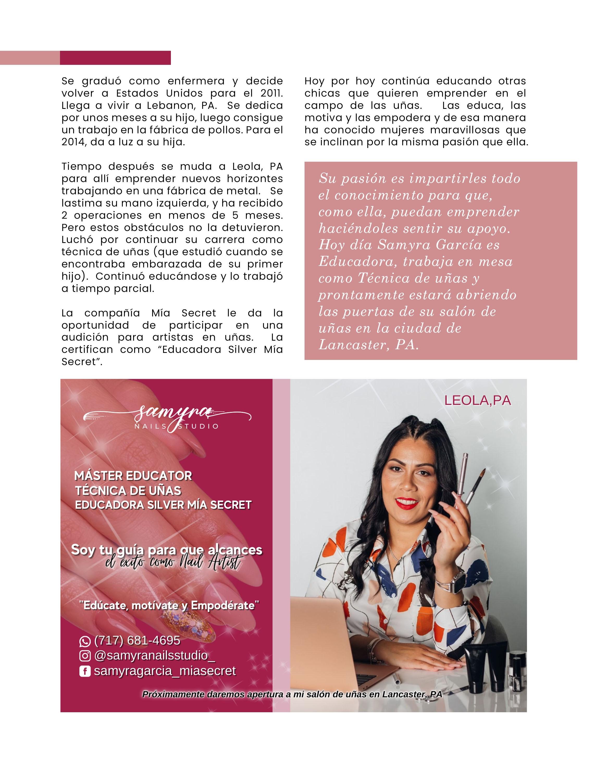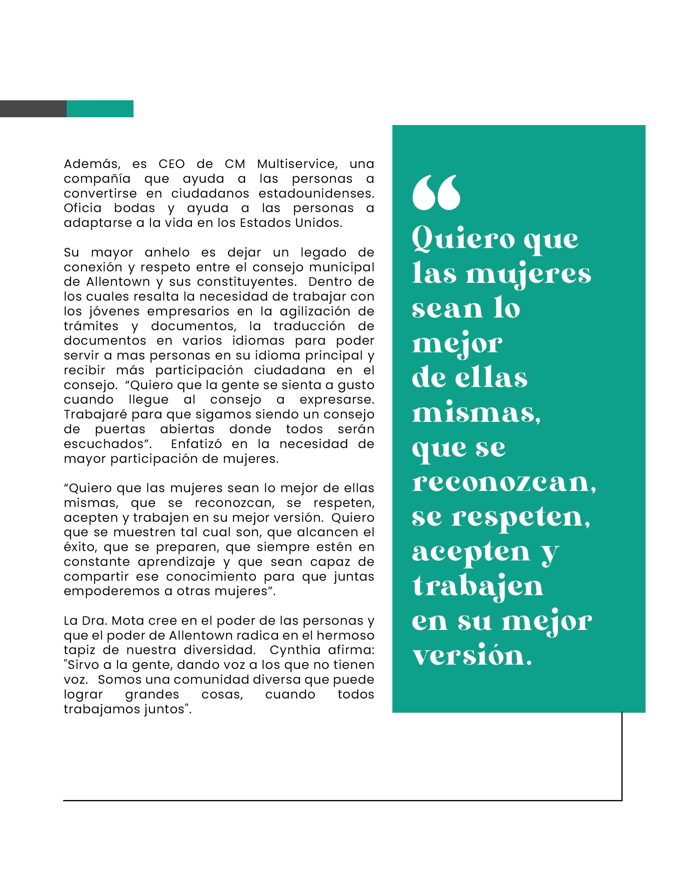 Gerente General Wanda García Roque Directora Michelle Laureano Roque Portada Fernando Palacios Peregrino Advertysing Arte Grafico DBM Group Colaboradores Rosaida Meléndez Negrón Mujer Lehigh Valley La Revista, Edición 6. Publicada anualmente por Producciones Asolique. Todos los derechos reservados. Prohibida la reproducción total o parcial sin previa autorización. El nombre de Mujer Lehigh Valley La revista es propiedad de Asolique. P. O Box 1528 Bethlehem, PA mujerlehighvalley@gmail.com18016 2 4 Tendencias del 2022 4 CONTENIDO La caja de botones 5 Cynthia Mota 6 Evelyn Batista 8 Corazón de servicio 10 Nilce Cruz 11 Samyra García 12 Maravillas del jugo verde 14 Yahaira Grullón 16 Carla M. Ortiz 18 Damaris Rentas 20 Paula Espinal 22