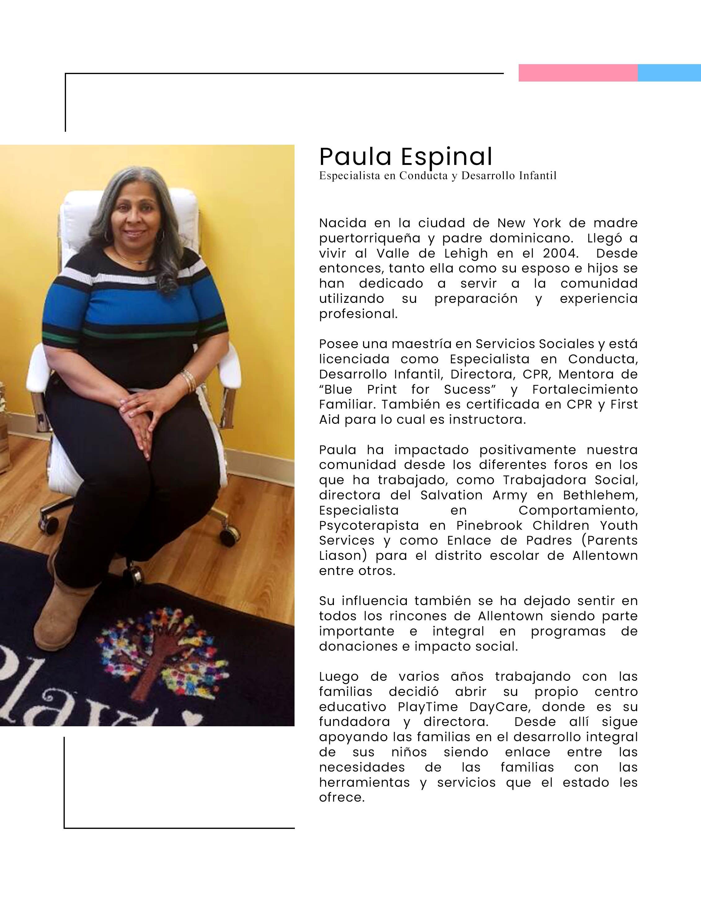 La Sra. Paula Espinal, MS, LBS es la directora de Playtime Daycare. Obtuvo su maestría en servicios humanos y posee una licenciatura especial de comportamiento en niños, jóvenes y adultos diagnosticados con Nacidaautismo.enlaciudad de New York, segunda de cuatro hijos. De descendencia puertorriqueña y dominicana. Casada por más de 30 años, 5 hijos y cuatro nietos.