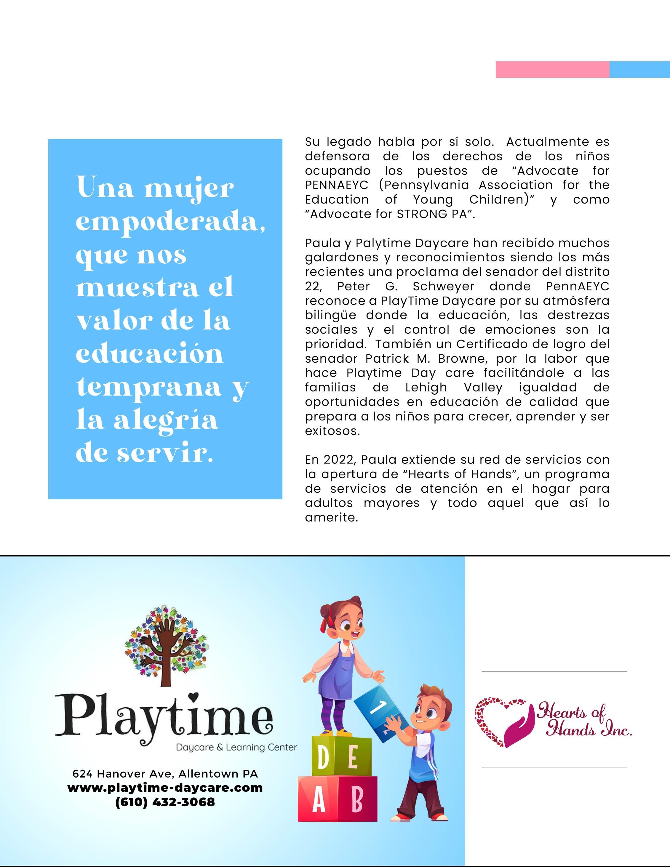 23 ha sido galardonado por varias instituciones por el trabajo positivo que realiza con los niños y la comunidad. Recibieron el premio Daycare Hispanic Business of Business Leader of the year” de La También, recientemente, recibieron una proclama del senador, Peter G. Schweyer donde PennAEYC reconoce a Playtime Daycare por su atmósfera bilingüe donde la educacion, las destrezas sociales y En este nuevo año, Paula extiende su red de servicios un programa de servicios de atención en el hogar para adultos mayores
