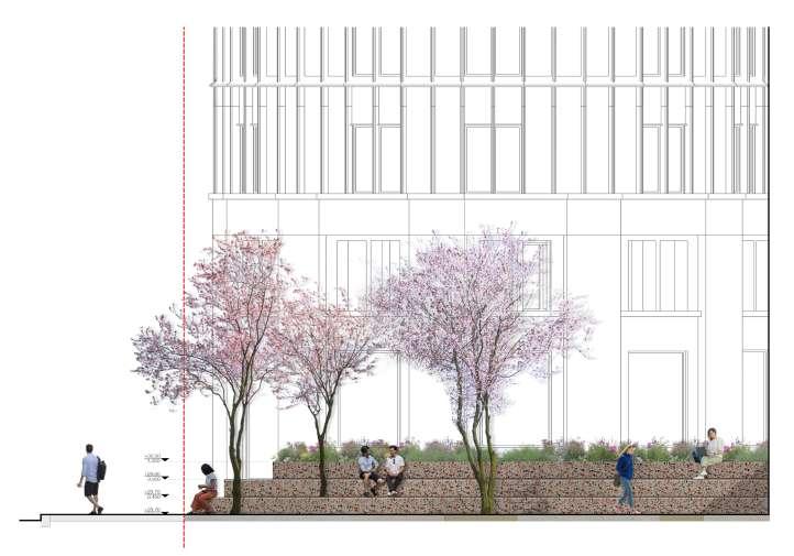 The South side of Chalk Farm Road already has a good provision of street trees, and the landscape proposal will further enrich this character by adding additional trees along the street frontage.