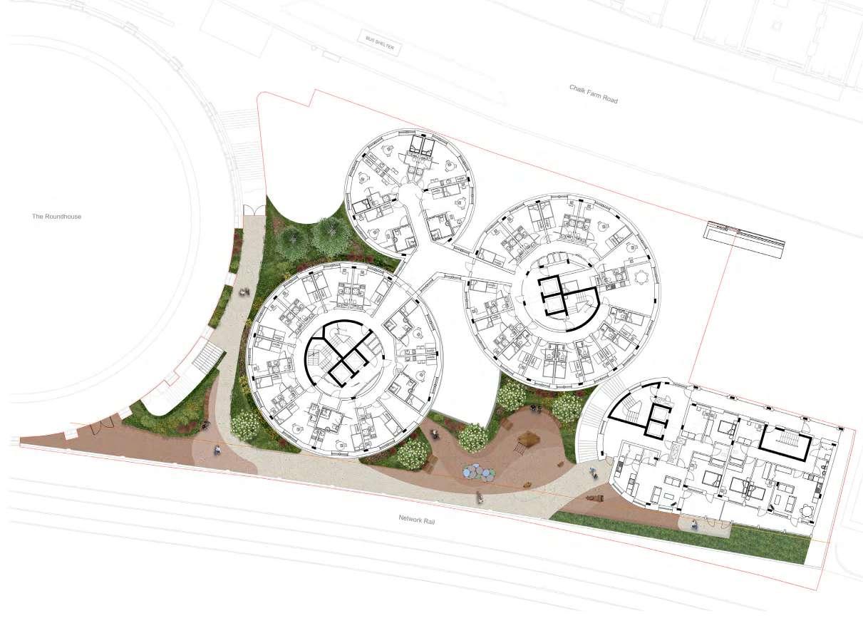 At ground level, the proposed public realm introduces a new rest and meeting place adjacent to The Roundhouse. On the first floor, there is an external landscaped area on a podium to the south of the site. This space is designed to offer play areas for younger residents and amenity spaces for all age groups, shared between families and students.