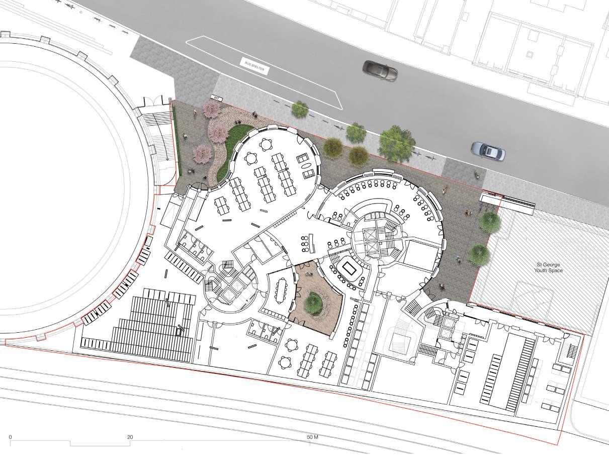The ground-level landscape creates a new public space for pedestrians and event-goers at The Roundhouse, while also providing potential future connectivity with the adjacent youth space.