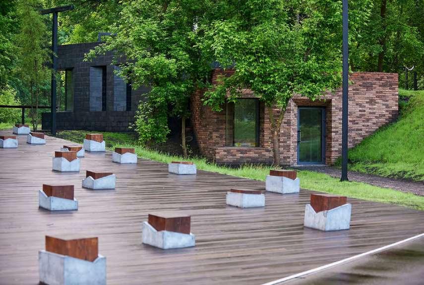 During the soviet times, a futuristic-looking concrete cover was built above the pump room of the spring. The park was mainly used as a place to get drinking water and as a place to take a plunge in the cold water bath filled with spring water. Our initial task was to renovate the part of the park around the water taps and the stone bath, but after examining the whole area of the ravine we offered the city authorities to turn the whole site into a water landscape park. The new plan involved not simply renovating a small section of the park, but also using the water from the spring to create a system of picturesque lakes. Apart from the lake system, we designed two bike overpasses (for the 3.5 km long bike loop not to intersect with pedestrian walkways), children’s playgrounds, a sports ground for people of all ages, and a wooden terrace for doing yoga. We preserved 4 hectares of natural wooded area, only adding gravel paths and admire-the-nature garden chairs to the terrain. One of our top priorities was to leave a large part of the area intact, in its natural state.