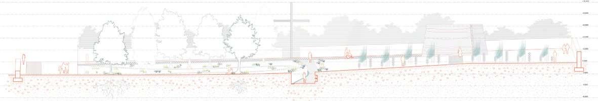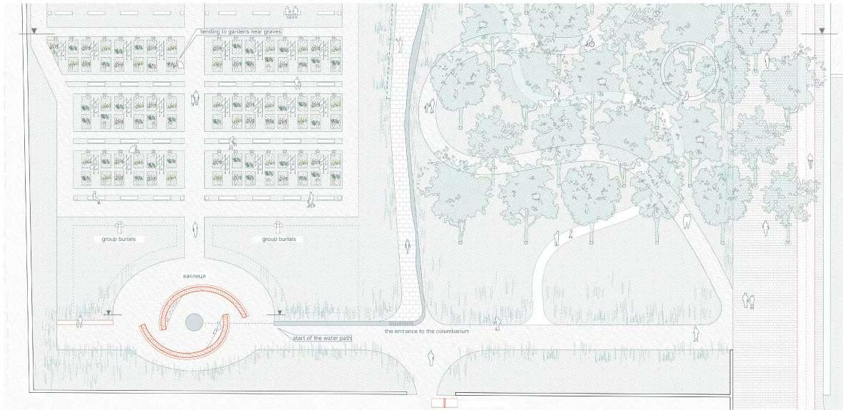 of the sectional view through the burial area, columbarium, and memorial square (Scale 1:200)