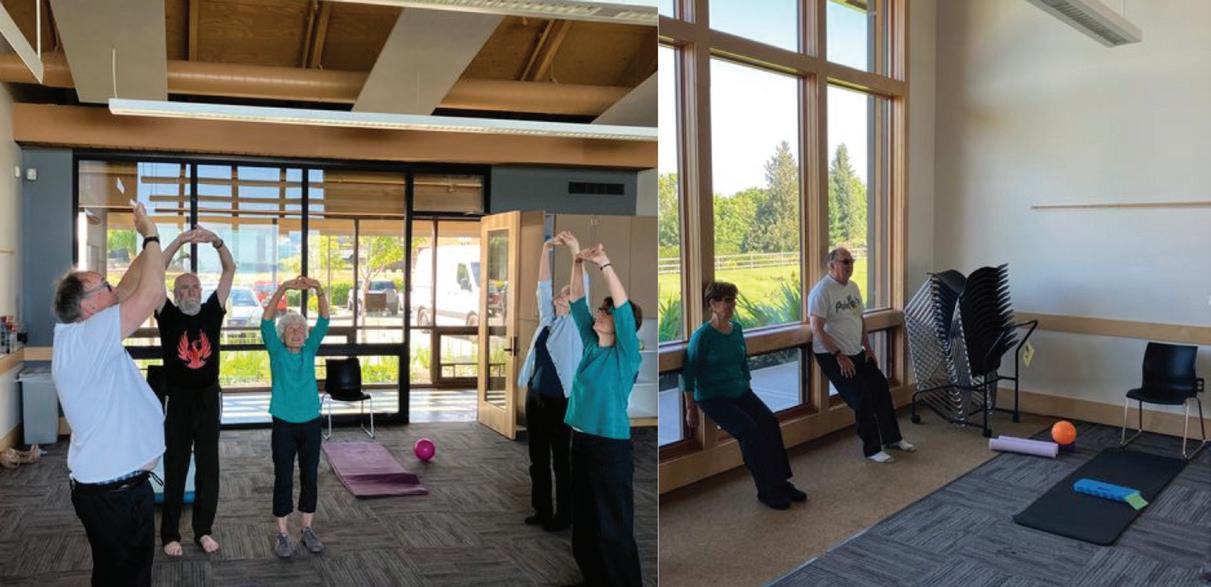 • The Fireplace room features a stone fireplace, armchairs, table, chairs, and benches. This is a wonderful space for relaxing, working on your laptop, enjoying a puzzle or exploring the mini library managed by Mukilteo Senior Association.