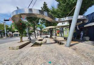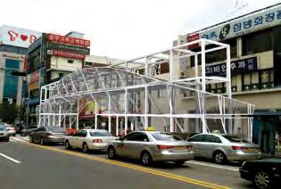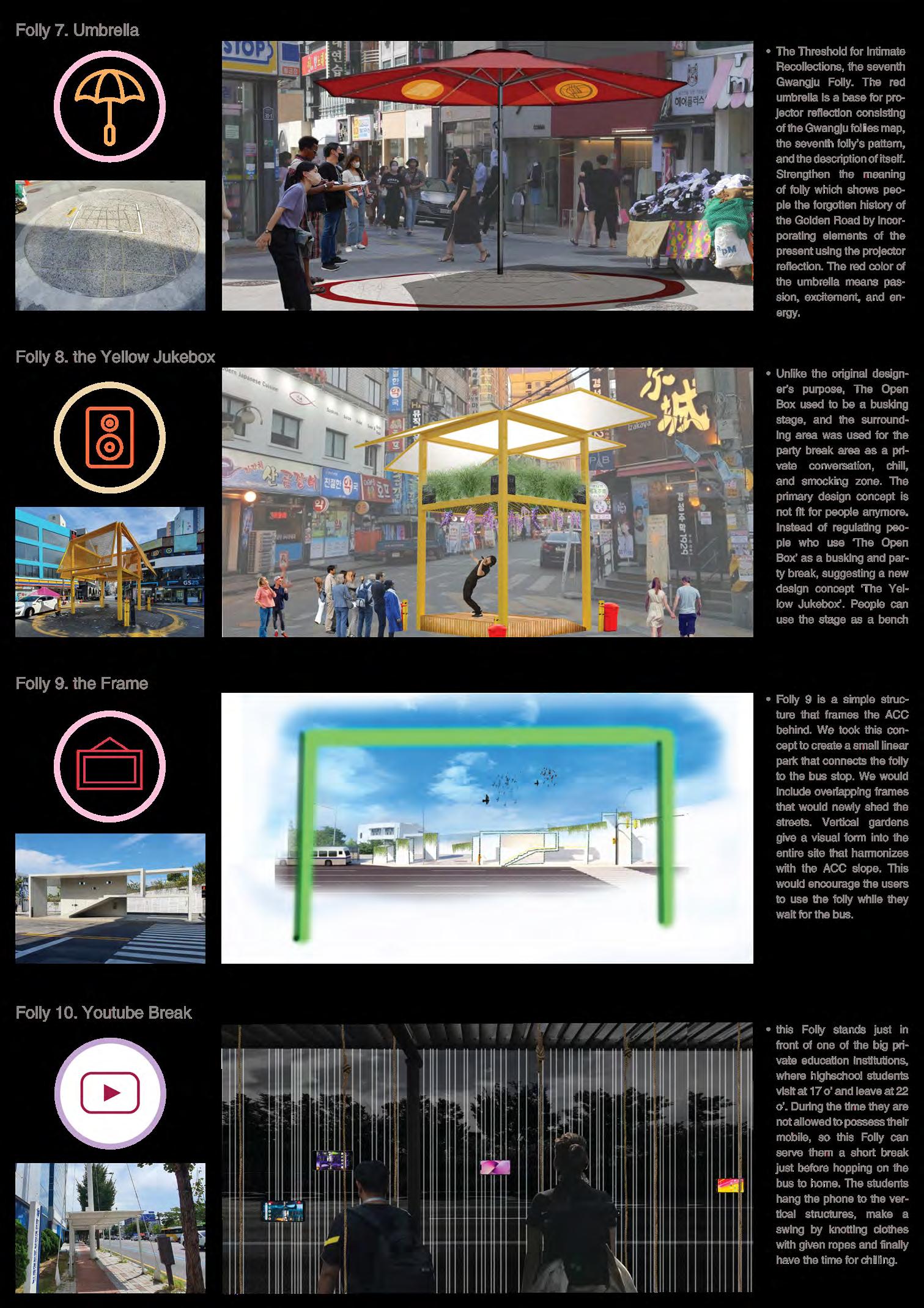 FollyI shapes the landscape of Gwangju Downtown. Paths and buildings of the historical urban area of Gwangju makes a unique contrast with the newly designed (2011) follies. However, follies not yet have permeated into the citizen's daily life due to follwoing three resaons: 1. Historical context of the Folly1 path is not recognizeble 2. Districts around follies have different population composition and social interactions between the groups is lacking. 3. Majority of follies don't perfrom as working elements of the city, but stay as isolated islands.