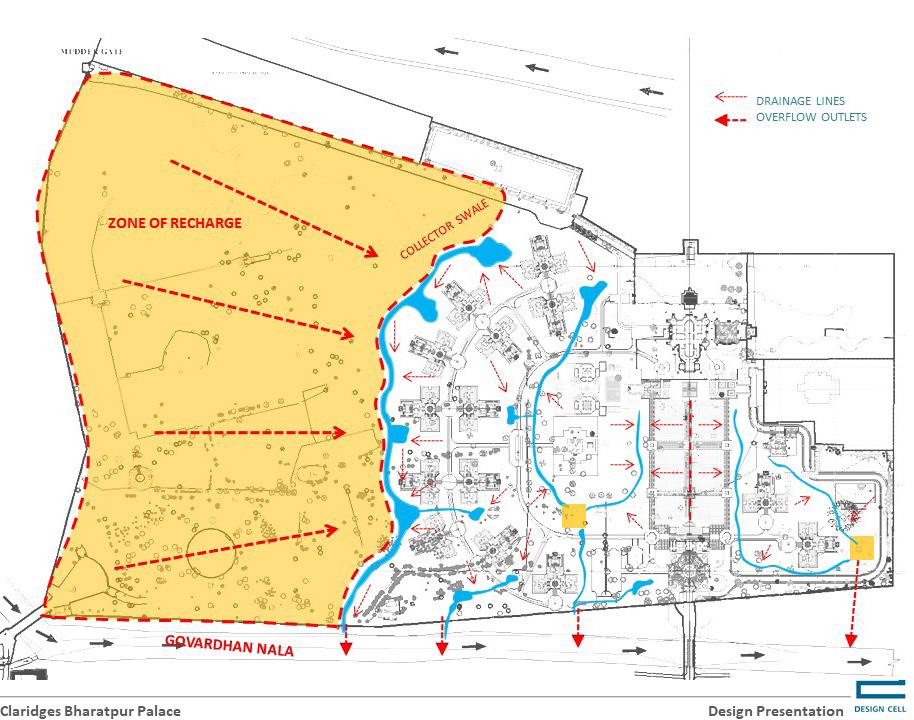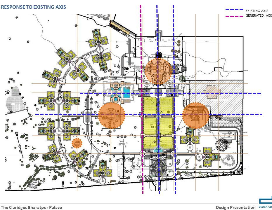 Elements like screen walls or “jali” provided privacy and a sense of being amidst nature. The “Savan Bhadon” (welcome pavilion) and garden with water channels created an aura of luxury while providing large semi-enclosed spaces to relax, interact, and enjoy. A paved terrace was created around the existing fountain to be used as alfresco dining, infront of the palace.