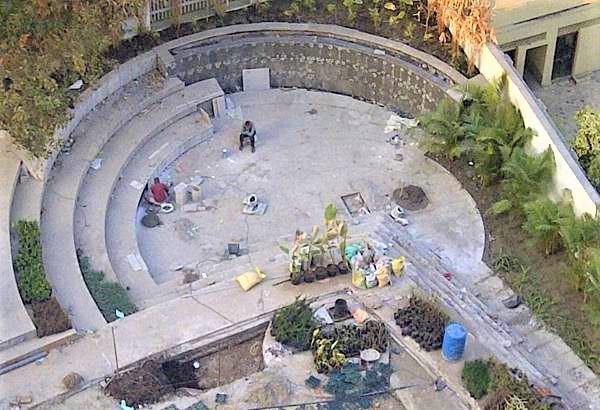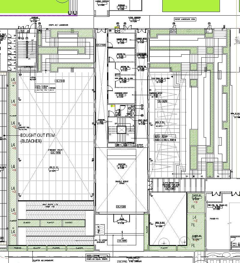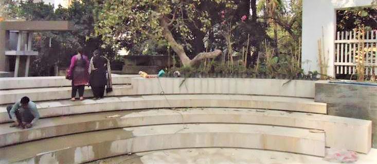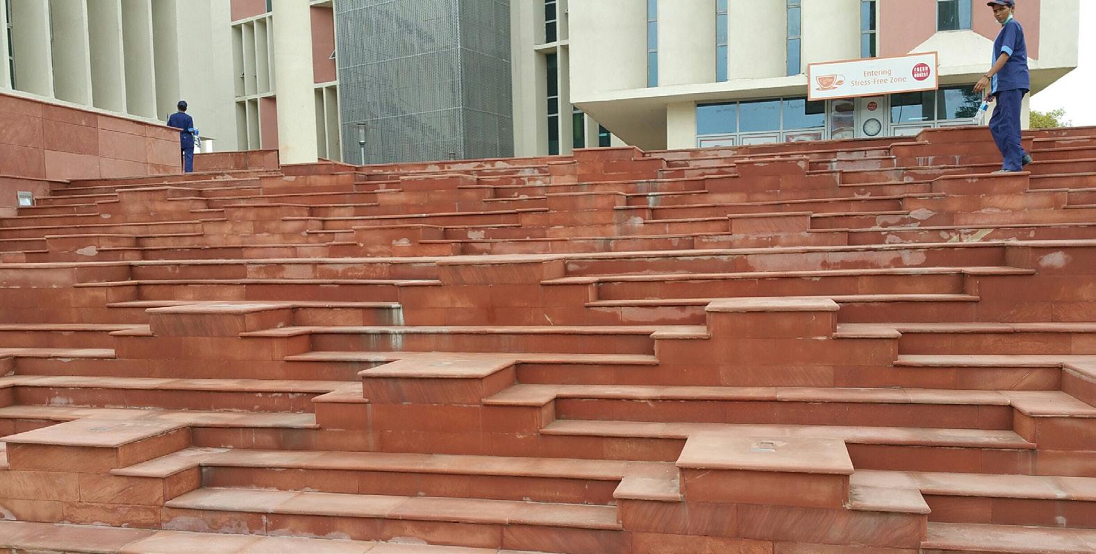 The amphitheater transcend between the first floor and basement with a level difference of 3.5 meters. It is mainly three tiered with long planters seggregating the tiers. The design of the winding staircase is inspired by the step wells of India. TThe planters and tree shade help in reducing the heat island effect to make it an iconic GRIHA Green building rated project. The rainwater runoff is collected and used in the irrigation and the excess is discharged in a rain garden for groundwater recharge.