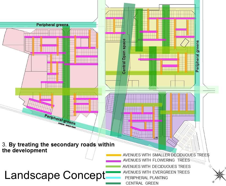 The roads of the city are landscaped such that they form the connecting element tying the varied building architecture into one urban fabric. The landscape for 24 m, 18m, and 12 m wide roads is coordinated to accommodate the drainage and utility lines. Parking is designed beside continuous pathways under shadow of trees.