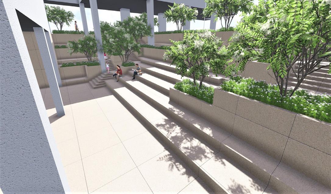 The most important design feature is an amphitheater that is designed to keep the safety of the children of the school. The concept has a series of steps that were very strategically designed to make sure the fall of a person is limited. This is done using split levels and planters, winding stairs, and amphitheater seating. The solution is remarkable and is a key feature for students’ interactive space.