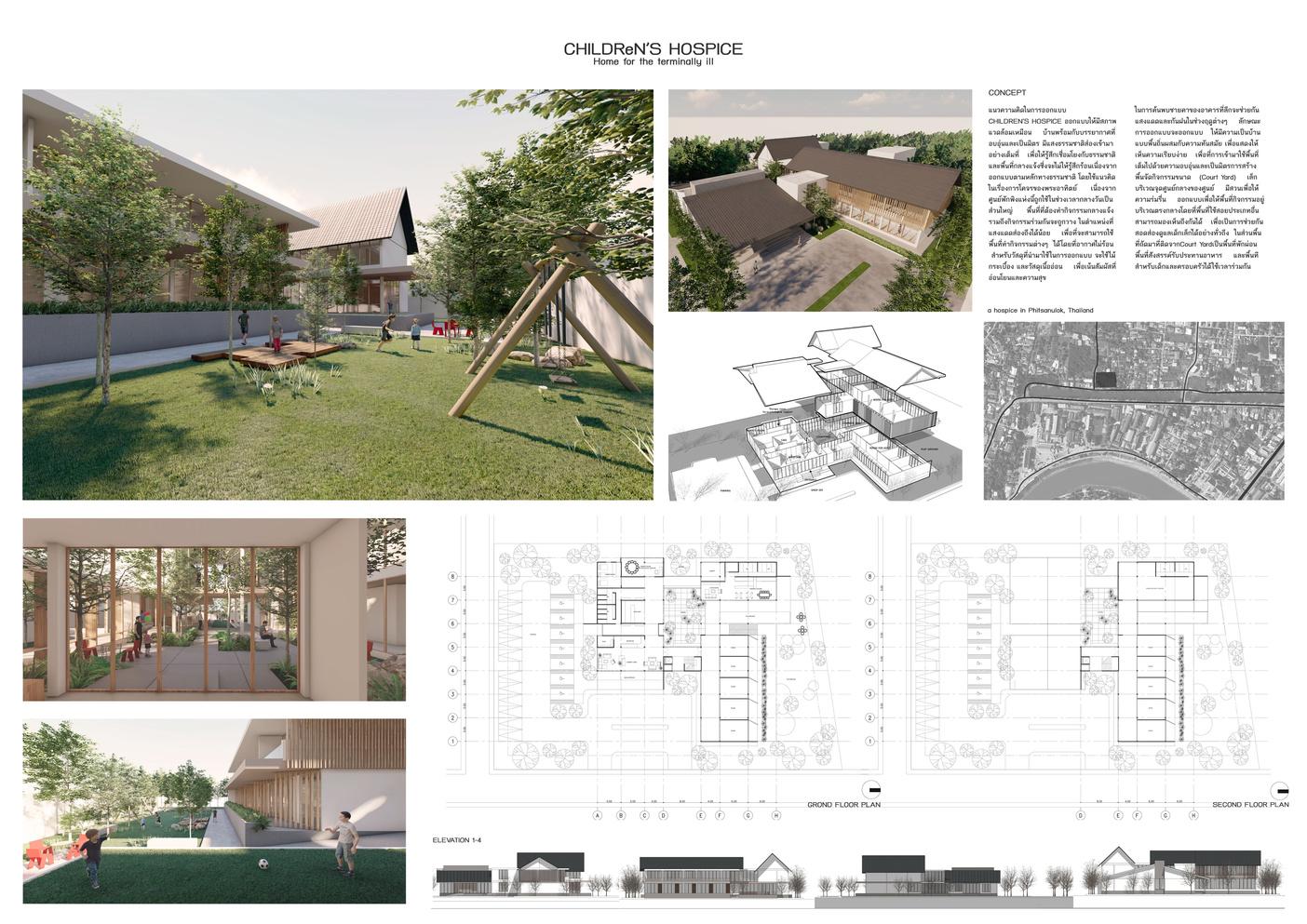 แนวความคดในการออกแบบ CHILDREN’S HOSPICE ออกแบบใหมสภาพ แวดลอมเหมอน บานพรอมกบบรรยากาศท อบอนและเป นมตร มแสงธรรมชาตสองเขามา อยางเตมท เพอใหรสกเชอมโยงกบธรรมชาต และพนทกลางแจงซงจะไมใหรสกรอนเนองจาก ออกแบบตามหลกทางธรรมชาต โดยใชแนวคด ในเรองการโคจรของพระอาทตย เนองจาก ศนยพกพงแหงนถกใชในชวงเวลากลางวนเป น สวนใหญ พนททตองทากจกรรมกลางแจง รวมถงกจกรรมรวมกนจะถกวาง ในตาแหนงท แสงแดดสองถงไดนอย เพอทจะสามารถใช พนททากจกรรมตางๆ ไดโดยทอากาศไมรอน สาหรบวสดทนามาใชในการออกแบบ จะใชไม กระเบอง และวสดเนอออน เพอเนนสมผสท ออนโยนและความสข