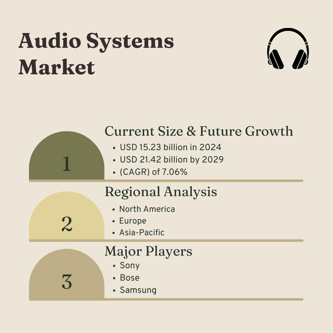 The Audio Systems Market Size is projected to reach USD 21.42 billion by 2029, growing at a compound annual growth rate (CAGR) of 7.06% from its estimated value of USD 15.23 billion in 2024. This growth reflects the increasing demand for high-quality Audio Systems across various sectors, including entertainment, automotive, and professional audio.